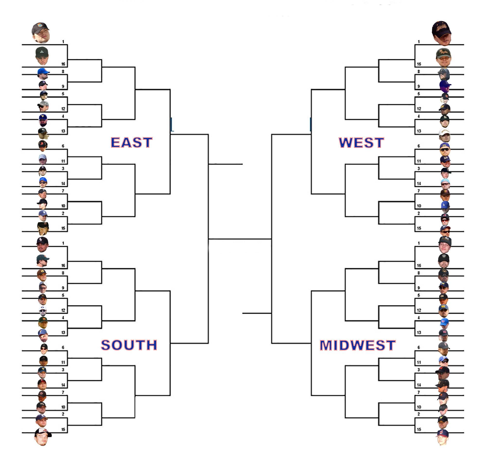 I separated the hats to the best of my ability into four regions based on the locations of the hats’ teams. I then seeded the hats in each region based solely on how random their appearance on Leo’s head felt. For example, the Florida Atlantic University cap got the 1-seed in the South, while a University of Miami cap got the 16-seed. Also, seeding was occasionally rigged so that hats of the same team were forced to face each other in the first round.