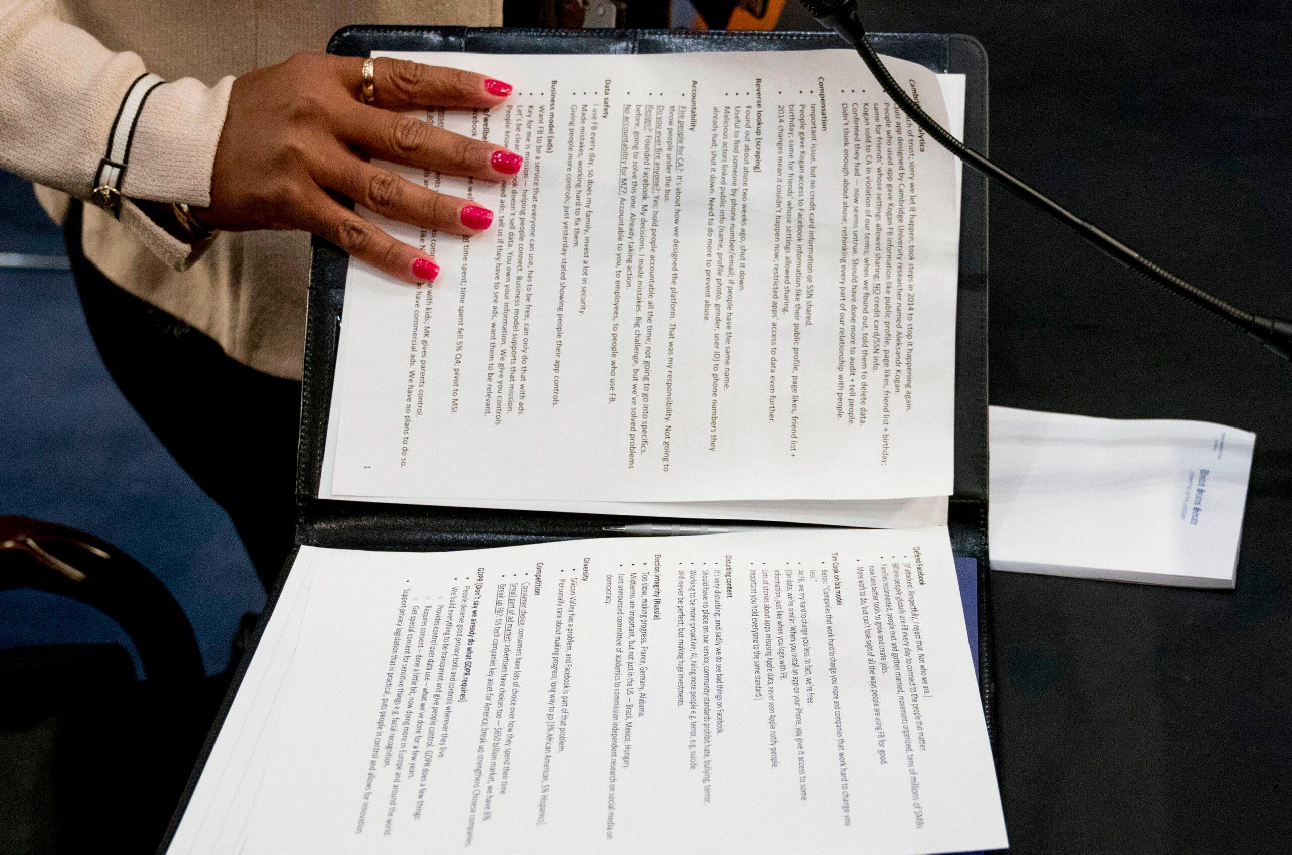 Alyssa Bereznak: Zuckerberg’s painstakingly boring five-hour testimony Tuesday included one brief, welcomed break. But in his haste to leave the room—presumably to empty his bladder, dunk his head in a sink of cold water, and re-up on beta blockers—Zuckerberg left his notes splayed out on the table, lying in plain sight in a room full of journalists.