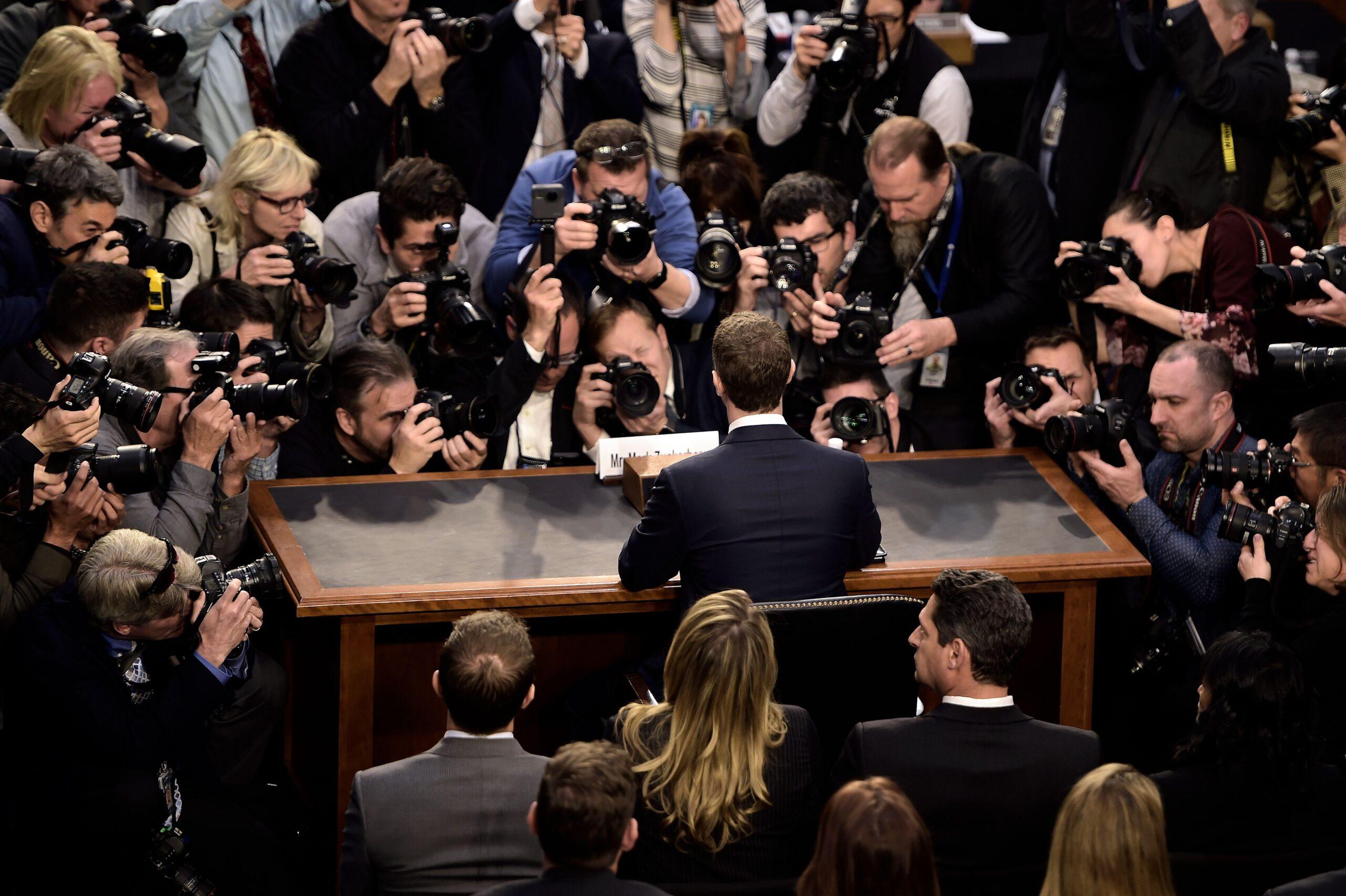 The day before Rush’s question, Zuckerberg made his first appearance in the hot seat. A gaggle of photographers swarmed him as he sat alone, hands folded and eyes rheumy, prepared for scrutiny. It is important to note that Zuckerberg came to face this crowd voluntarily. He had not been subpoenaed and he was not under oath. Technically, he could leave any time he wanted. Yet, as the swarm of journalists made clear, he cannot avoid our gaze.