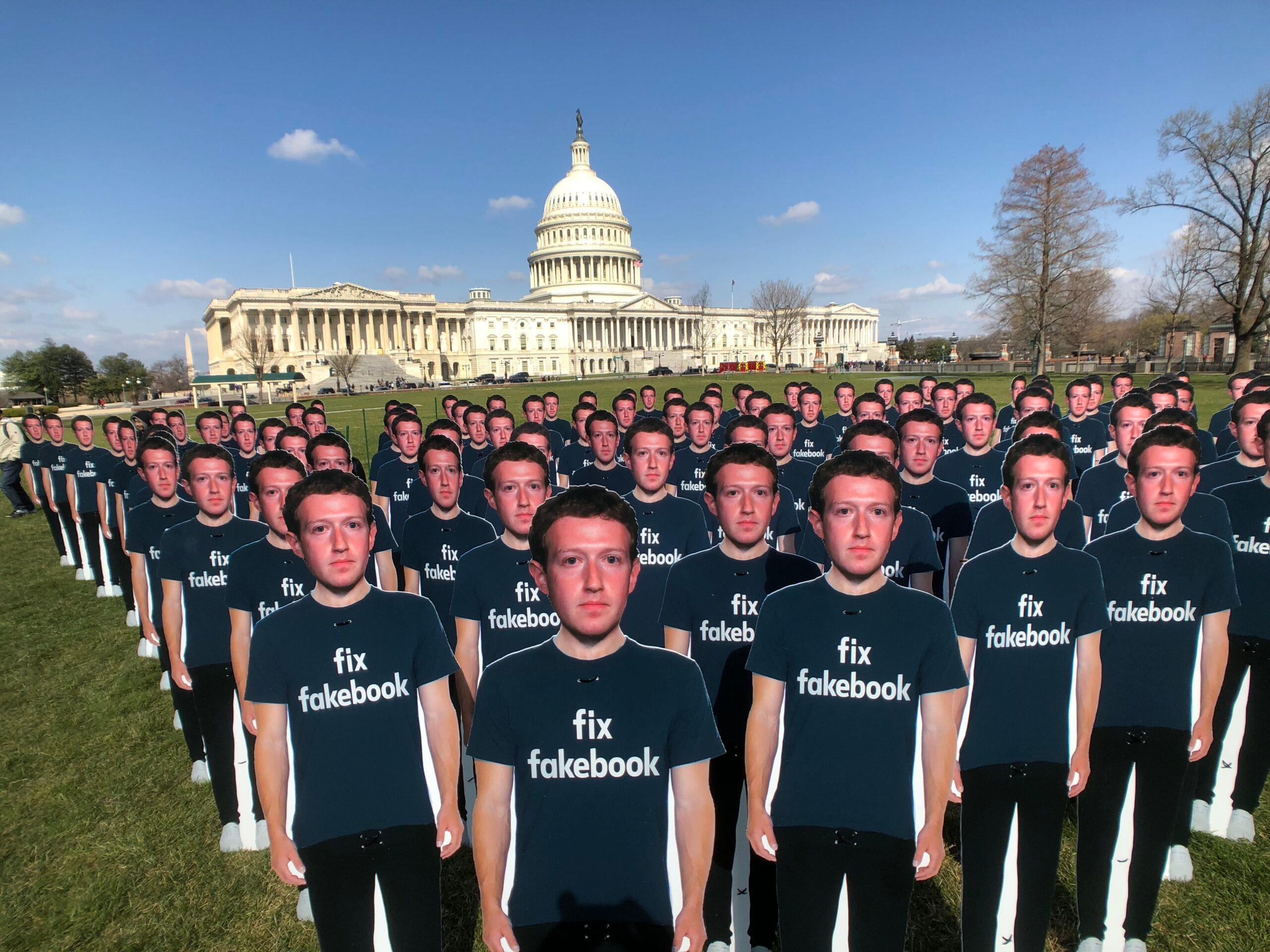 Avaaz has proposed several changes it wants Zuckerberg to make to his company, and it has taken out advertisements outlining their proposals on Politico and The Washington Post. The protest art is connected to concrete demands for the CEO. Yet it works more effectively in an unintended way: By gesturing toward the arrogance of Zuckerberg’s vow itself and the fact this one profoundly milquetoast man has maneuvered himself into such a position of consequence in the first place. The cutouts look like a squadron, but a particularly flimsy one, dwarfed by the government building they stand in front of. Even 100 Zuckerbergs looked like they could blow away in wind like feathers. The futility of this idea—that Zuckerberg alone could steer an entity that has grown into a controlling factor in global culture—is clear on the Capitol lawn. Even 100 versions of the same man looked weak.