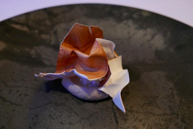 The end of the meal circles back to the study of shape and form that is introduced at the beginning: The ice cream is topped with intricate structures built to resemble potato skins. Biting into one creates a light, foamlike snap—at first I thought it was a piece of potato skin that had been given the astronaut-food treatment of freeze-drying. In reality, it’s a thin layer of meringue, hand-painted brown on one side, then toasted—the heat warping the meringue into the fanciful formation it eventually takes. It is Castagna’s signature dish for good reason.