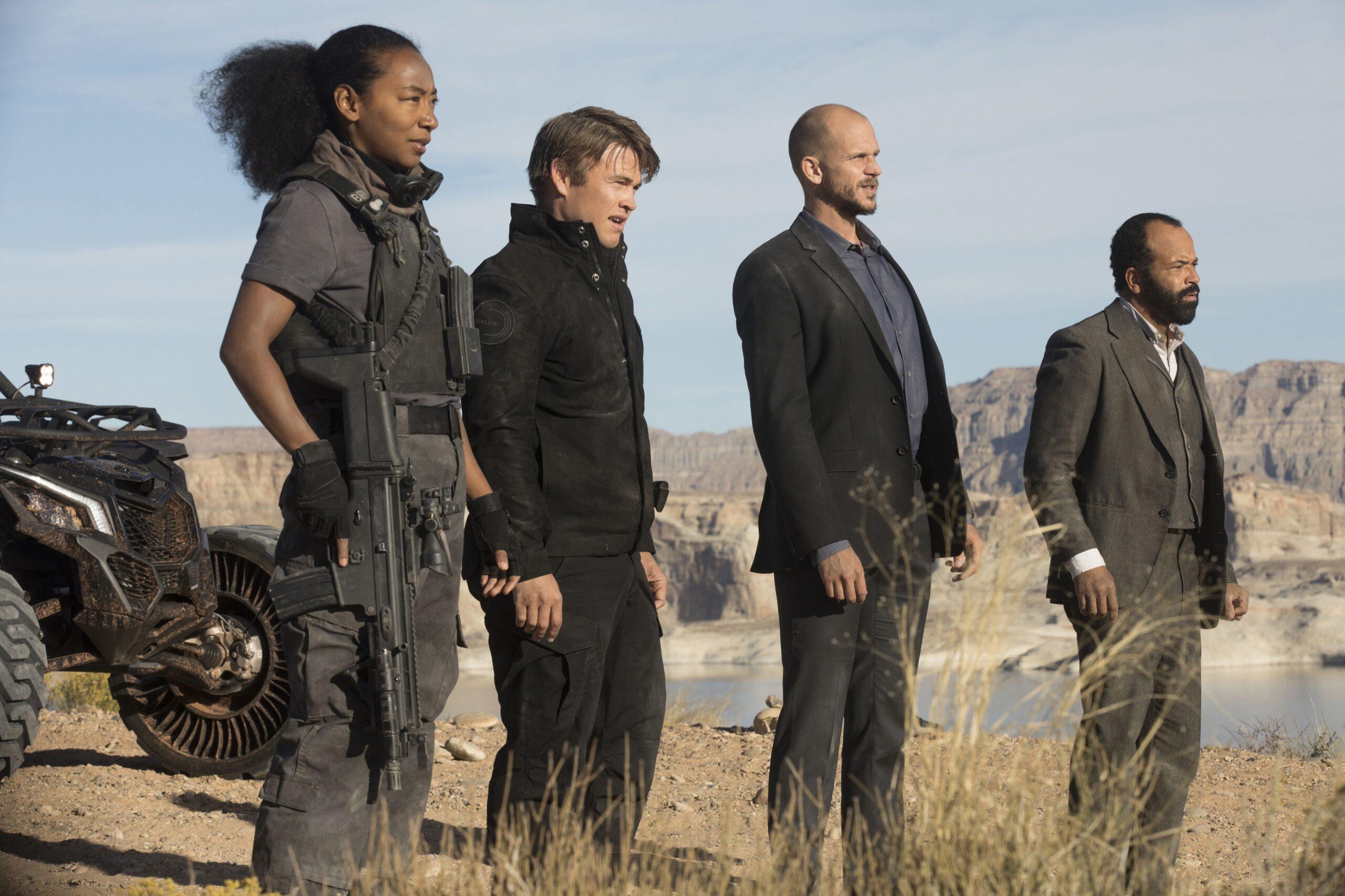 That conversation cuts to Bernard waking up in Inception limbo—I mean, on the beach in Westworld. We learn that it’s been two weeks since Dolores’s massacre at the end of the Season 1 finale, punctuated by the flies and vultures circling the rotting corpses of the dead partygoers. The Delos security team “mistakes” Bernard for a host before Westworld security chief and lesser Hemsworth brother Ashley Stubbs (Luke Hemsworth) “corrects” them. The head of the Delos’s security team, Karl Strand (Gustaf Skarsgard), asks Bernard—I’m paraphrasing here—”What the fuck is going on?”