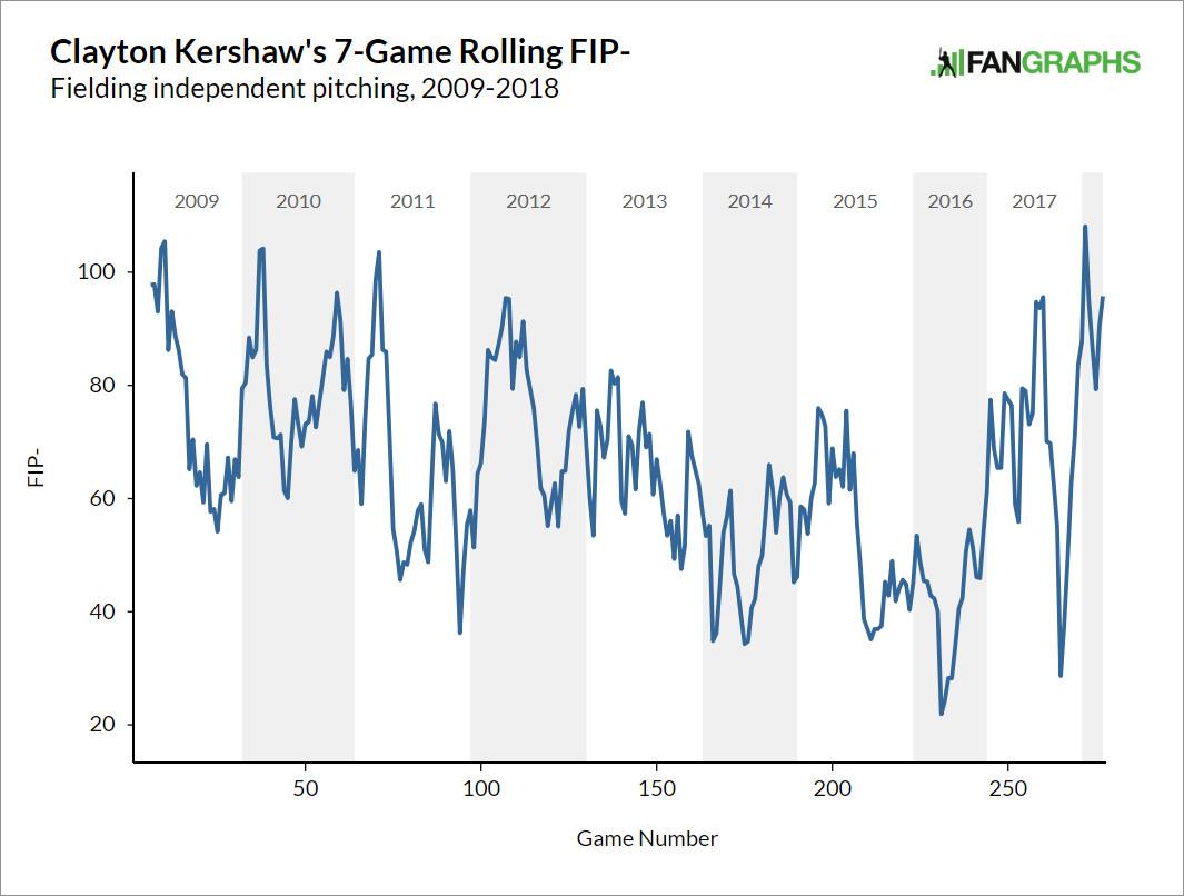 Of the 83 pitchers who had thrown at least 30 innings through Tuesday, Kershaw’s Deserved Run Average—Baseball Prospectus’s advanced assessment of a pitcher’s holistic contributions to run prevention—ranked 37th. Kershaw has pitched only seven games this season, so we’re still dealing with a fairly small sample. But he hasn’t been this ineffective in any other equal-sized regular-season sample since his rookie year, as evidenced by this graph of his rolling seven-game park-adjusted FIP marks over the past nine-plus seasons. The higher the line, the worse the pitching performance.