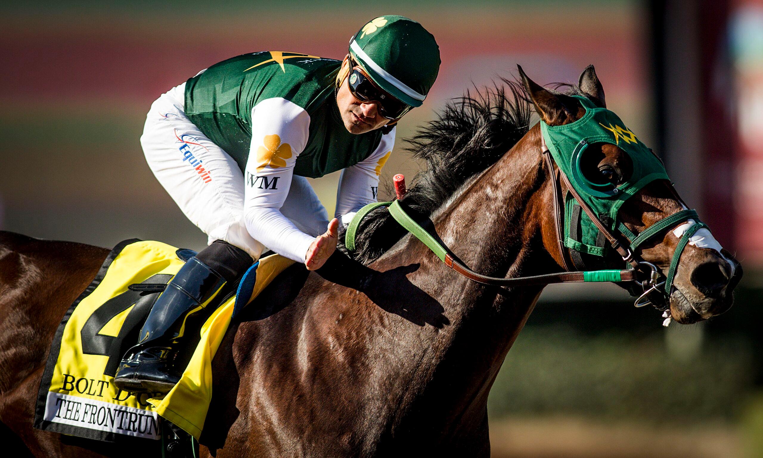 Ruis had wanted to name the new horse after himself, but then remembered that he had already named one of his earlier racehorses after himself, so the name was no longer available. Dismayed, Ruis gave the Greens the responsibility of naming his new prized purchase, and Aidan chose Bolt d’Oro, after the horse’s sire and the Jamaican track star Usain Bolt. Shortly after Bolt d’Oro arrived at the ranch, Green put him out in the pasture to run. “You could see the way he moved against the ground that he was superior to the other horses. It was effortless. He just floated across the ground there,” Green said. “He sort of trained himself. He didn’t just run around, he did it like he was training.”