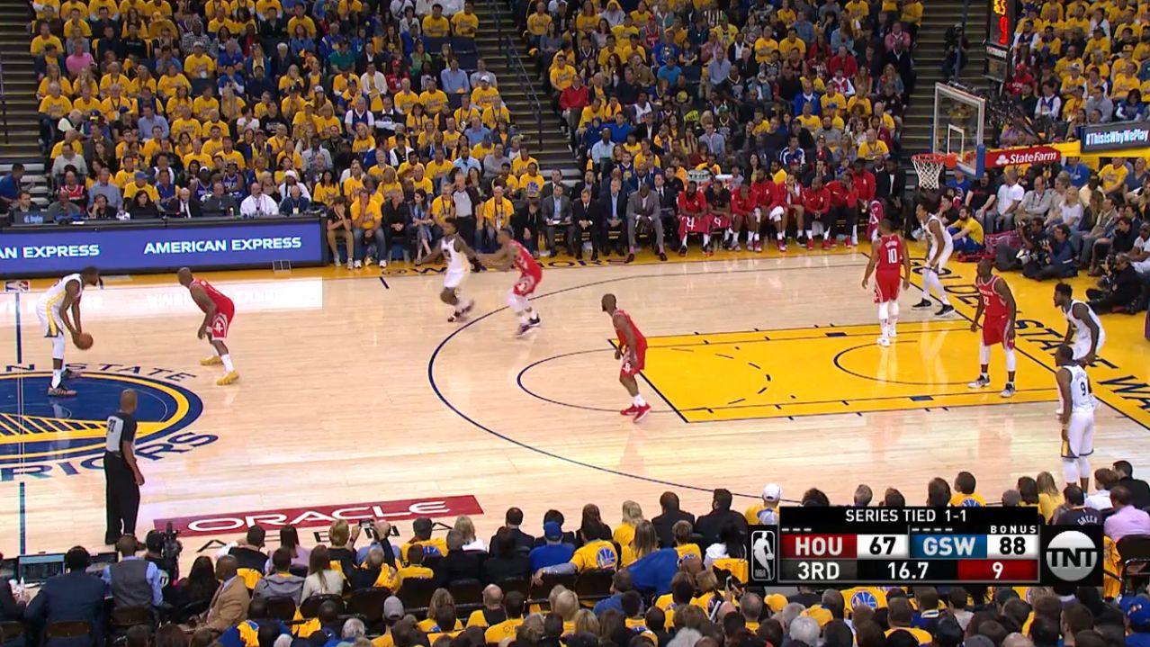 In space, no one can hear you scream, and no one can defend Durant. During one of the Warriors’ final possessions of a demoralizing third-quarter beatdown in Sunday’s Game 3 (the beginnings of which are seen in the image above), Nick Young forces a switch with Durant’s defender, P.J. Tucker, leaving KD on a minus defender in Gerald Green. He drains some clock, then darts a pass to Andre Iguodala on the right wing for an open 3. Iguodala uses a shot fake to get Luc Mbah a Moute to commit, and then delivers a sharp two-handed bounce pass to Jordan Bell, who proceeds to travel.