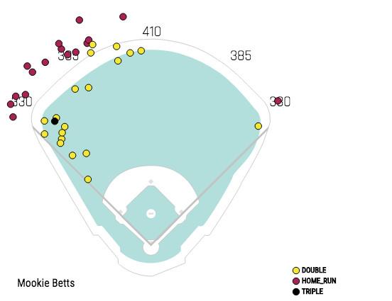 A deeper examination of Betts’s triumphs thus far reveals an immediate explanation for his offensive evolution. Here is a map of the landing spots for all 36 of Betts’s extra-base hits this season. They form a distinct pattern.