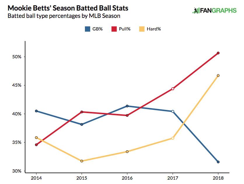 First, he’s pulling the ball at a career-best rate. Among 164 qualifying batters, only 11 have pulled the ball more frequently than Betts (Dozier places one spot ahead of him). Second, he’s hitting the ball in the air at a career-best rate. Only 13 qualifying batters have hit ground balls less frequently (Trout places two spots ahead). And third, he’s hitting the ball harder than ever before. Only eight qualifying batters have a higher hard-hit rate than Betts. Those trends pop in graphical form.