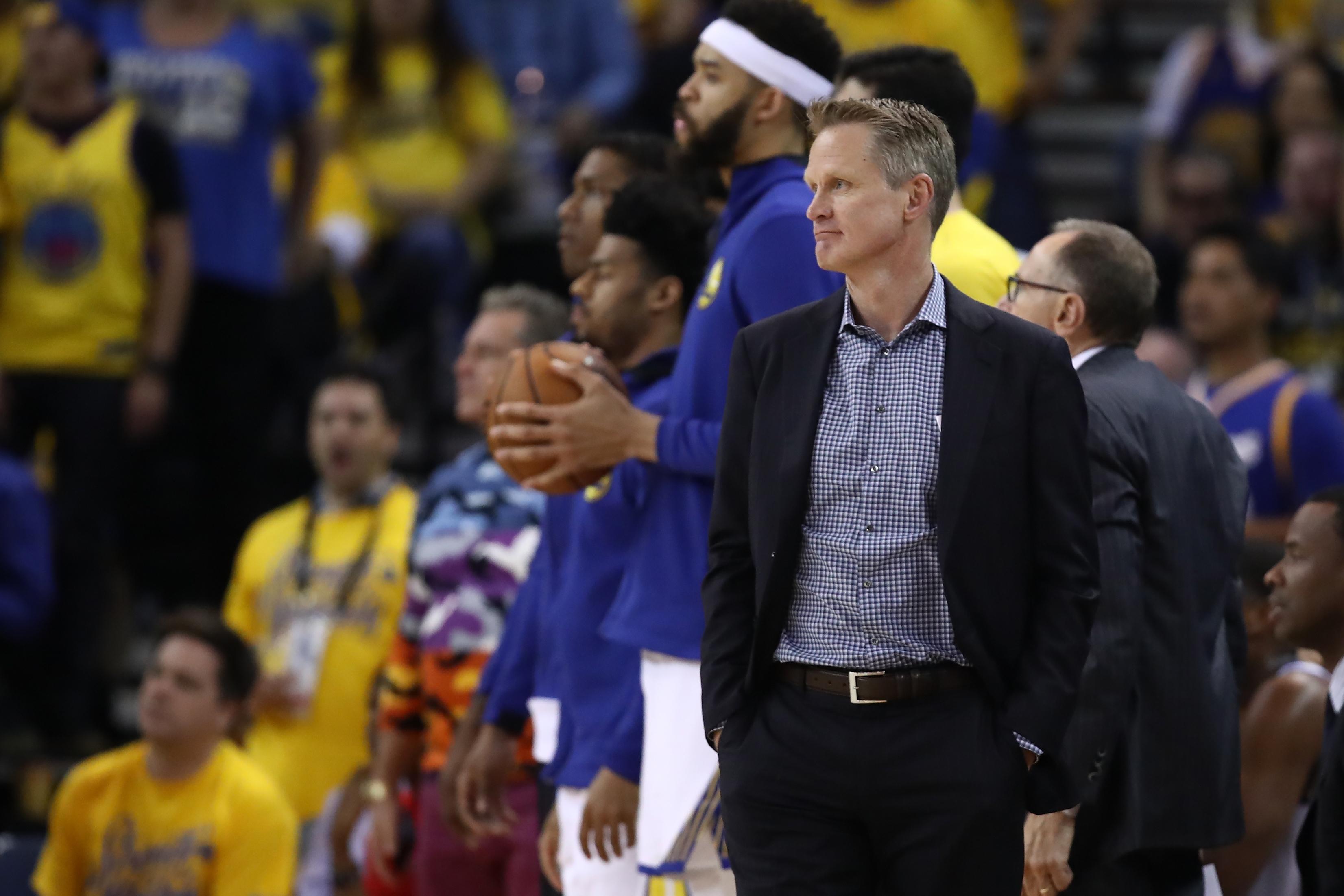 Saturday was yet another game where he had to find players to eat up minutes reserved for an injured Andre Iguodala. The Warriors coach gave Bell a whopping 21 minutes (the most he’s played this series), Young and Livingston got 16 and 15 minutes respectively, and even David West was in five whole minutes. Looney, who has taken Iguodala’s place in the starting lineup, was a glaring liability in the first half. When Houston got out to a 16-point lead in the first quarter, it appeared like the Warriors would have to go small the rest of the way; the Rockets were hitting too many shots and leaving Looney or Bell—sometimes both—out on an island on defense. But Kerr stuck to his guns and kept playing them both, typically alongside Durant.
