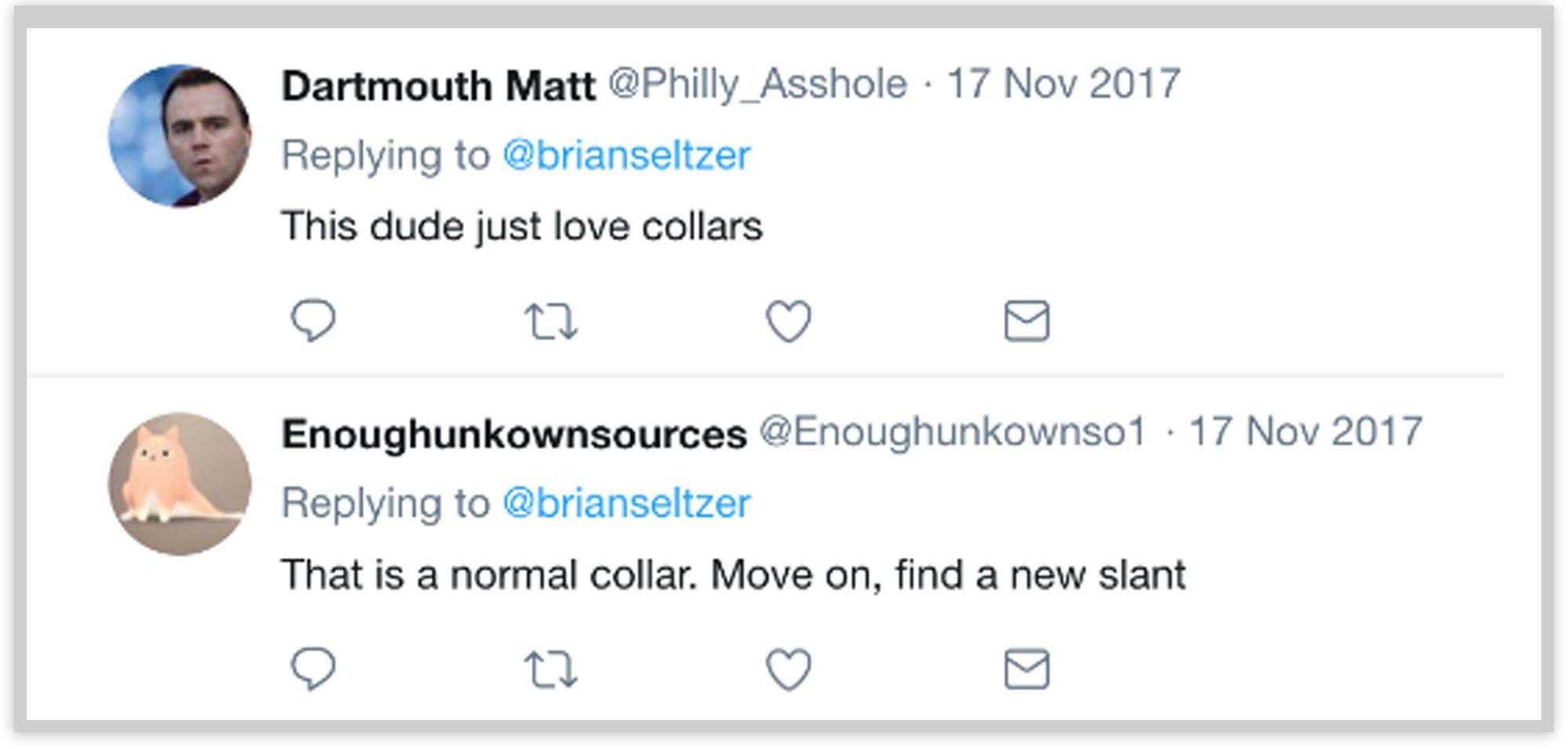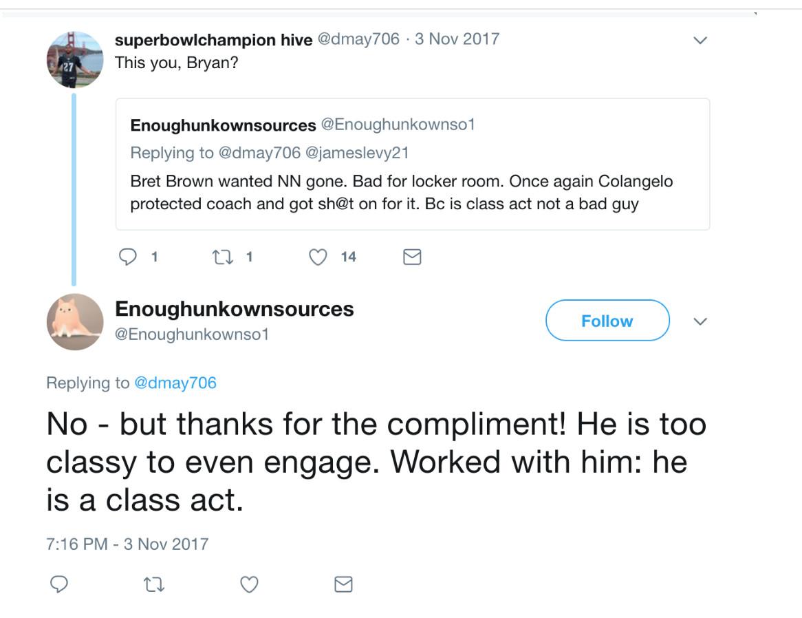 These coincidences have drawn suspicion from other Twitter users. On one occasion, when someone jokingly replied to one of the accounts with, “This you, Bryan?,” Enoughunkownsources claimed to know Colangelo. “No - but thanks for the compliment!” they answered. “He is too classy to even engage. Worked with him: he is a class act.”