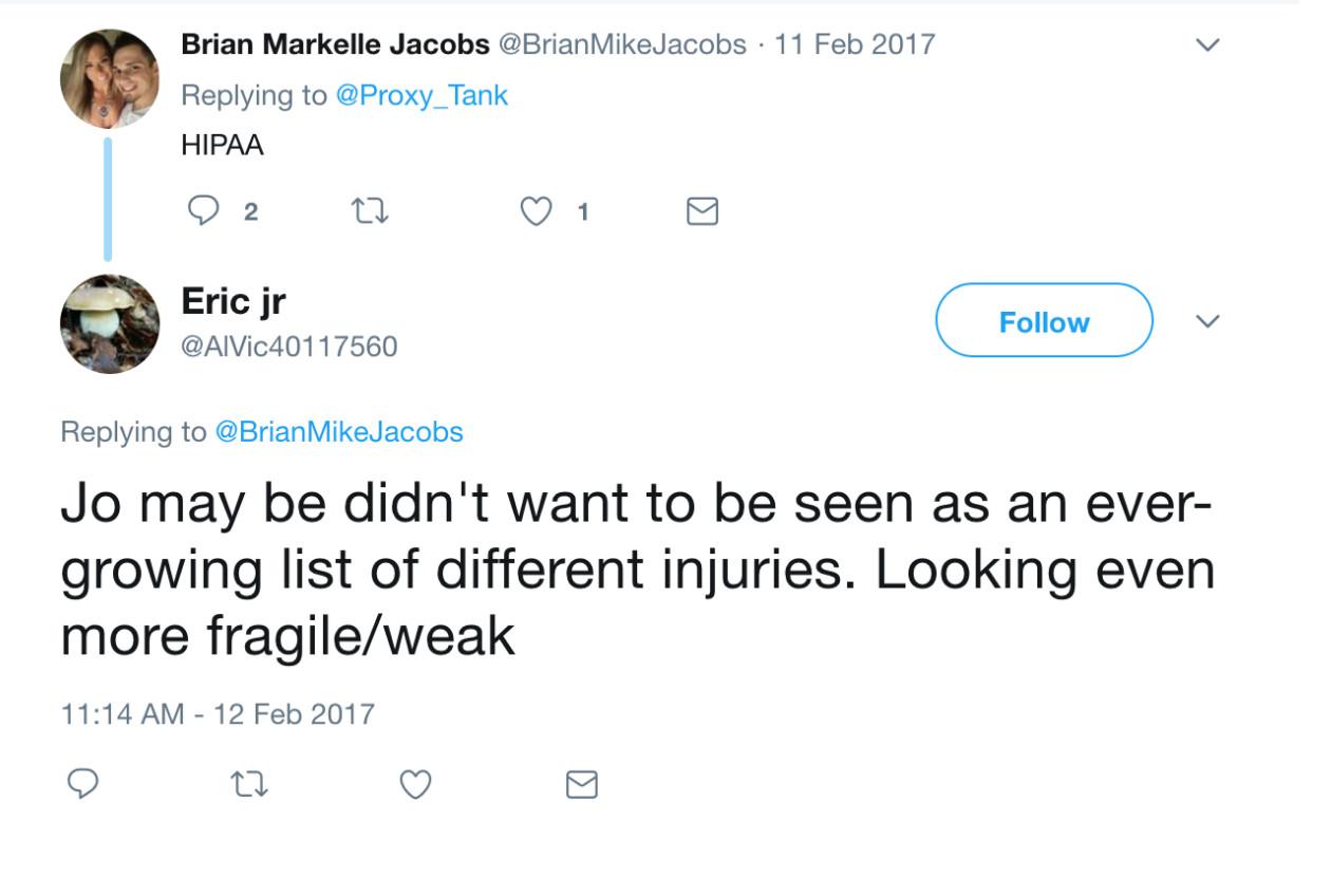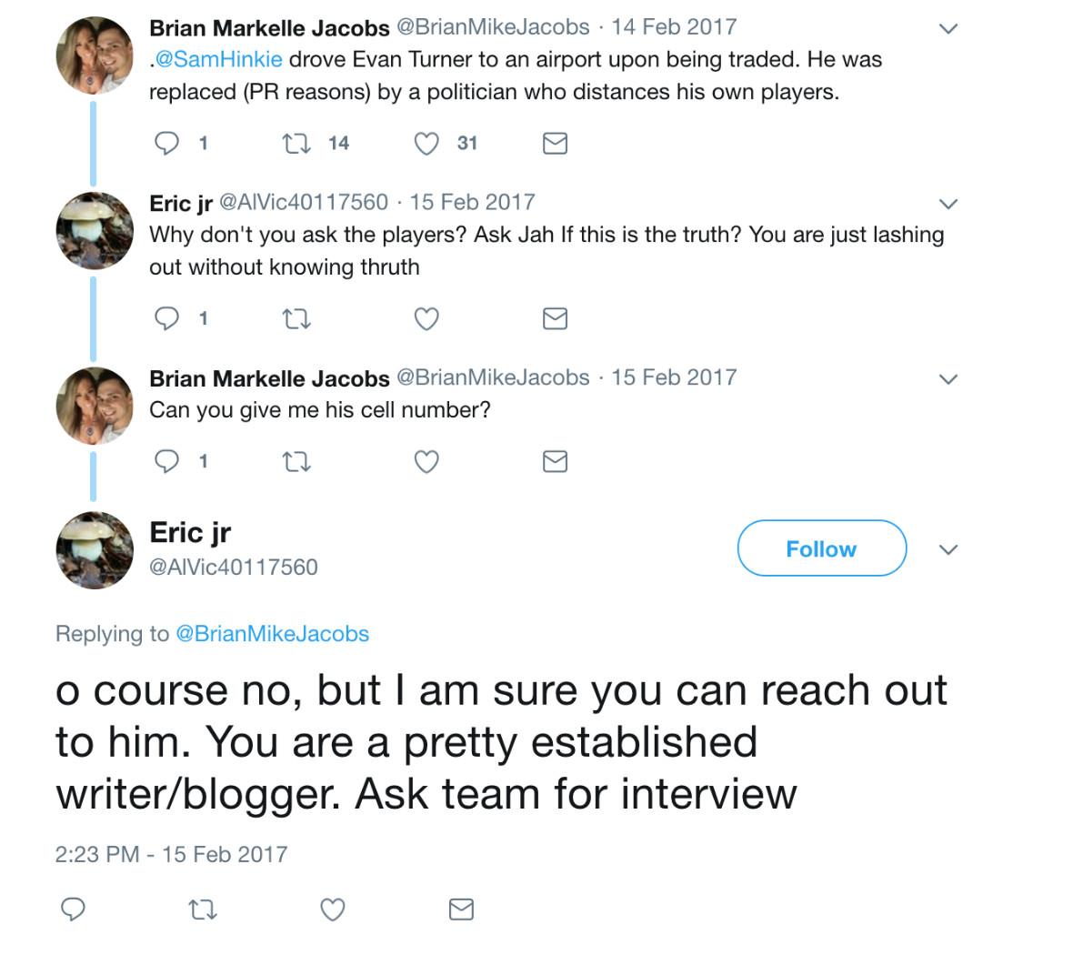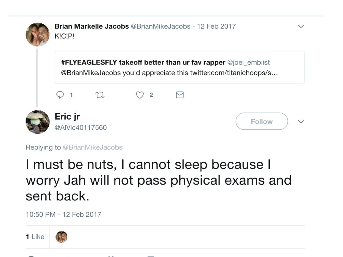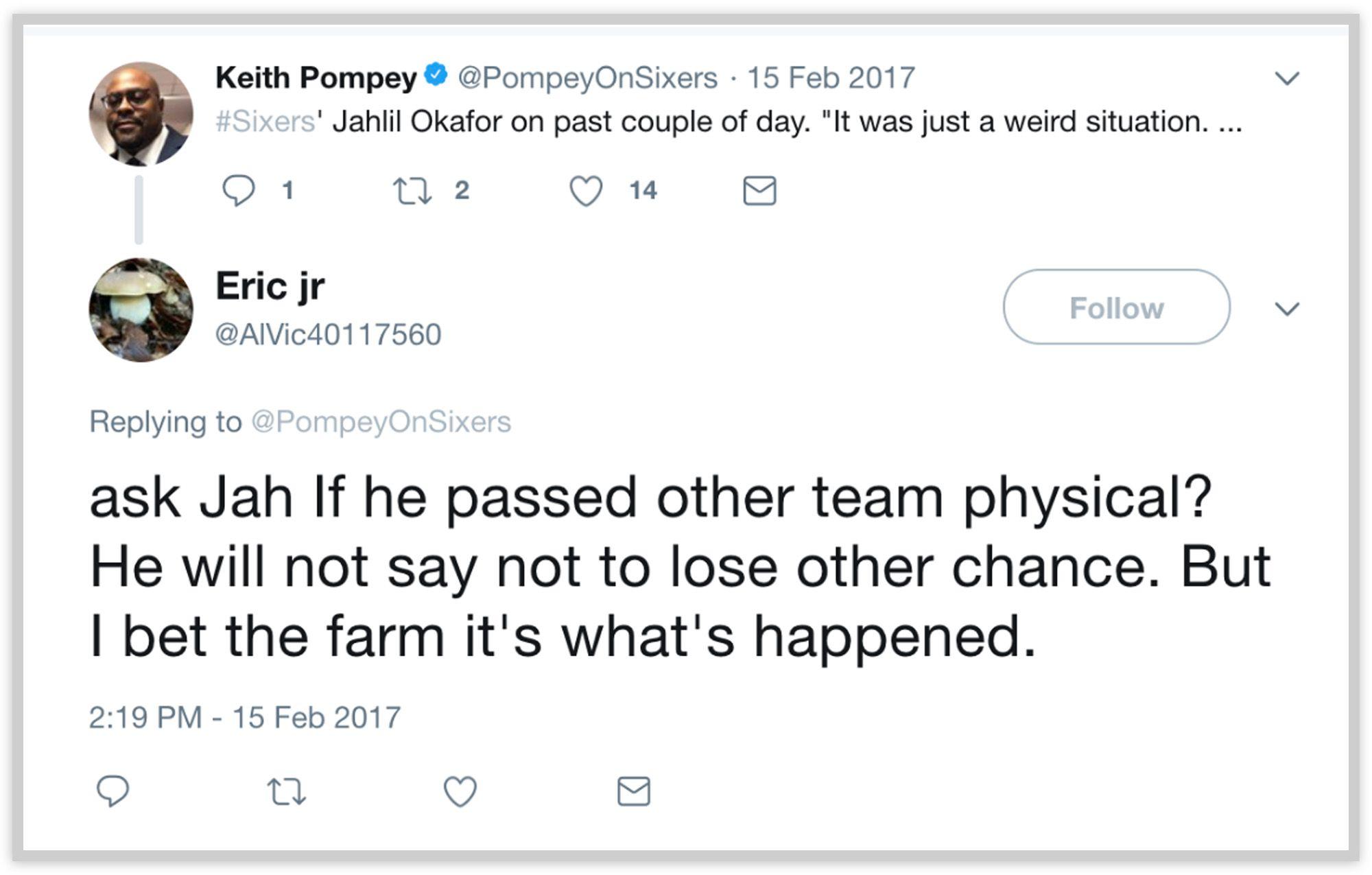 Most of the tweets were directed toward basketball journalists and often tried to goad them into investigating the otherwise unreported allegation. “Ask Jah If he passed other team physical?” Eric jr tweeted at Keith Pompey, a Sixers beat writer for Philly.com. “I bet the farm it’s what’s happened.” The account made a similar suggestion to Jacobs. “Ask Jah If this is the truth? … You are a pretty established writer/blogger. Ask team for interview.”
