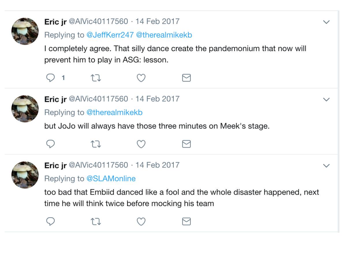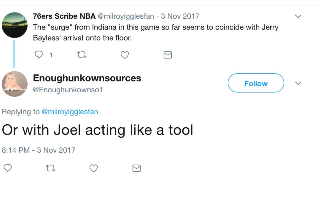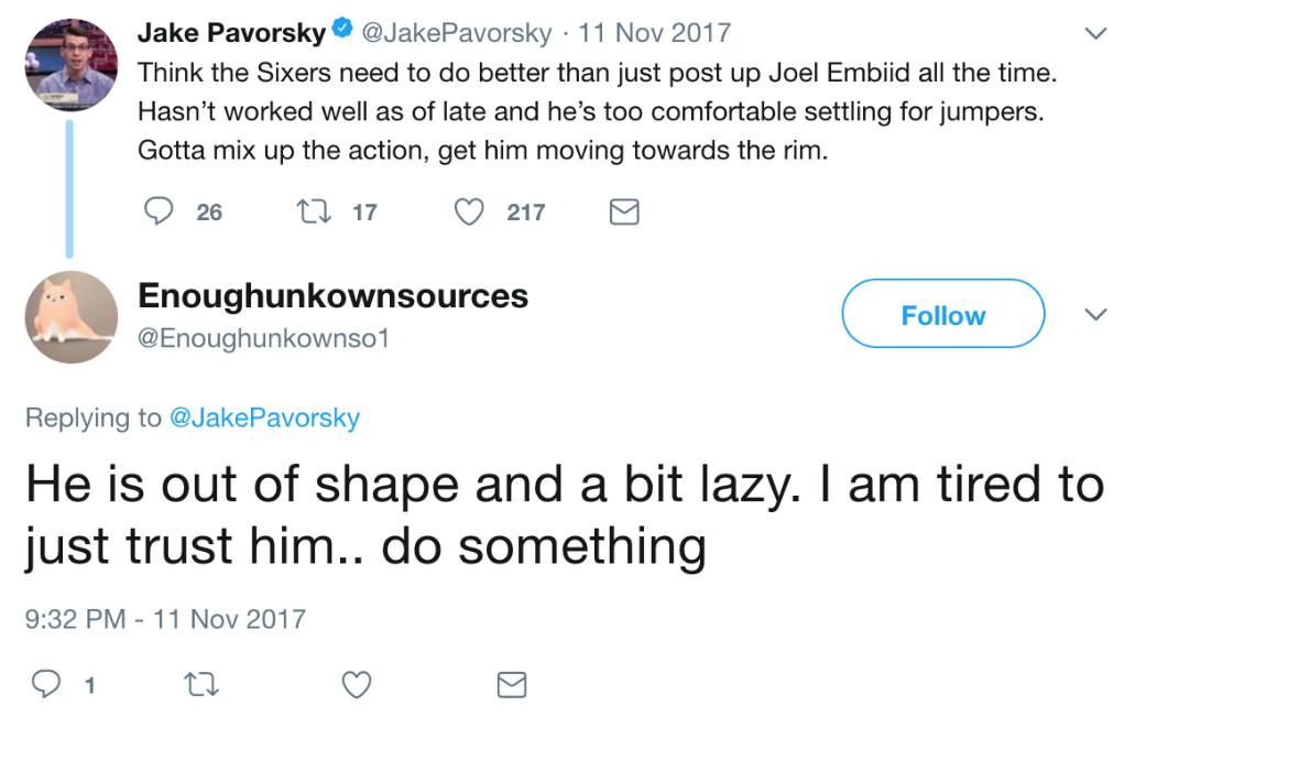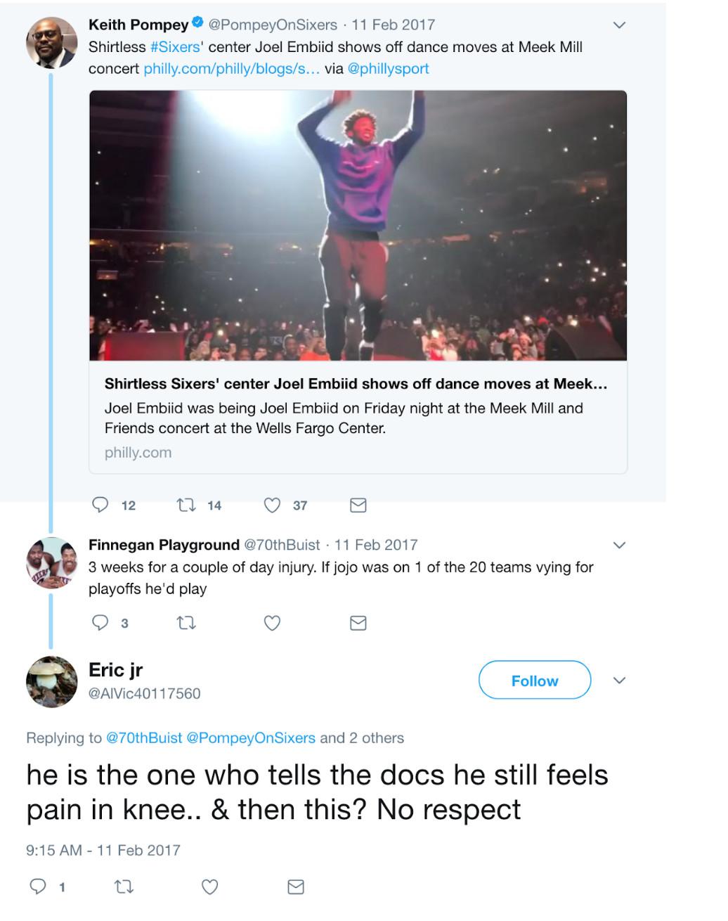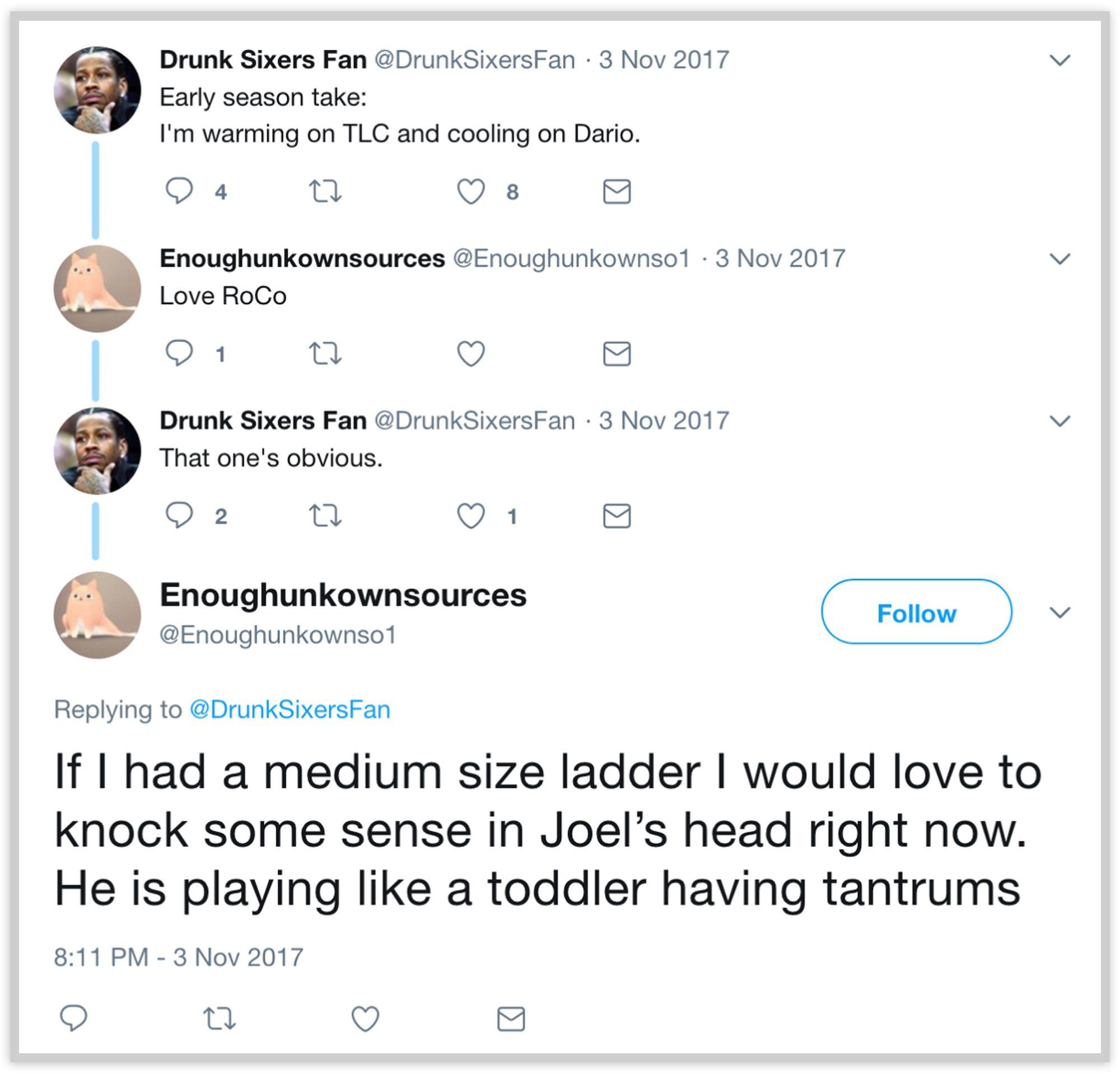 He grew incensed when Embiid took the stage and danced shirtless at a Meek Mill concert while sidelined by that injury. “Too bad that Embiid danced like a fool and the whole disaster happened, next time he will think twice before mocking his team,” Eric jr wrote on February 14, 2017. The account reacted with ire in another post. “If I were mngt I would step on a ladder and kick his b#**,” they wrote. (Nine months later, the Enoughunkownsources account employed similar phrasing: “If I had a medium size ladder I would love to knock some sense in Joel’s head right now,” the account wrote in November. “He is playing like a toddler having tantrums.”) As usual, Eric jr encouraged journalists to write about Embiid’s behavior. “He should be called out on this,” the account tweeted at Derek Bodner, a Sixers writer who now works for The Athletic, “nobody has the guts to do it.”
