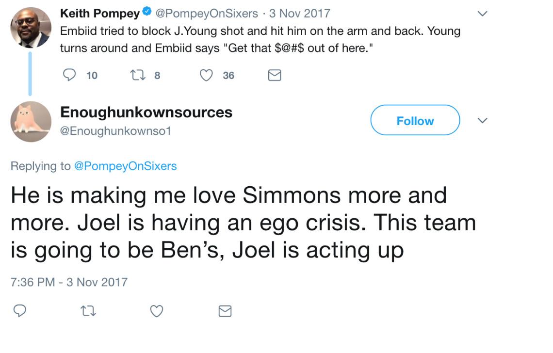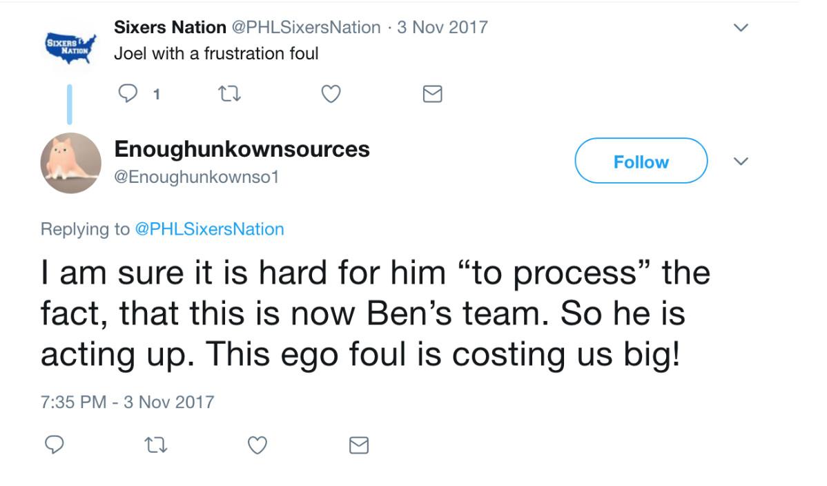 In recent months—particularly since Simmons’s emergence as a formidable talent—the accounts became increasingly hostile toward Embiid. Earlier this season, HonestAbe compared him unfavorably to the Knicks’ Kristaps Porzingis. “I am a Philly fan but out trade The process for The Unicorn in a heart bit,” the account wrote. “Such a smarter player.” And, in response to a Sixers Nation post about Embiid committing a foul, Enoughunkownsources replied: “I am sure it is hard for him ‘to process’ the fact, that this is now Ben’s team. So he is acting up. This ego foul is costing us big!”