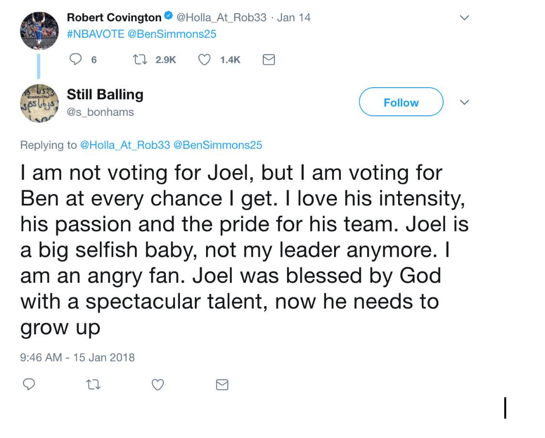 In January, in a tweet directed at the Twitter accounts of Simmons and Robert Covington, Still Balling tore into Embiid. “I am not voting for Joel, but I am voting for Ben at every change I get,” they wrote. “I love his intensity, his passion and the pride for his team. Joel is a big selfish baby, not my leader anymore.”