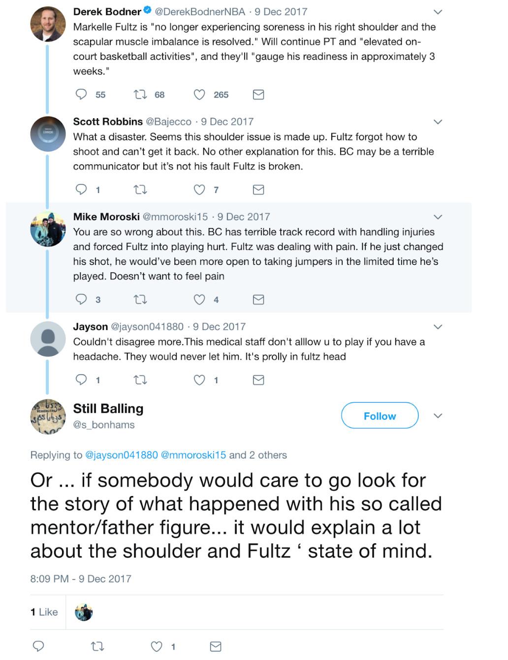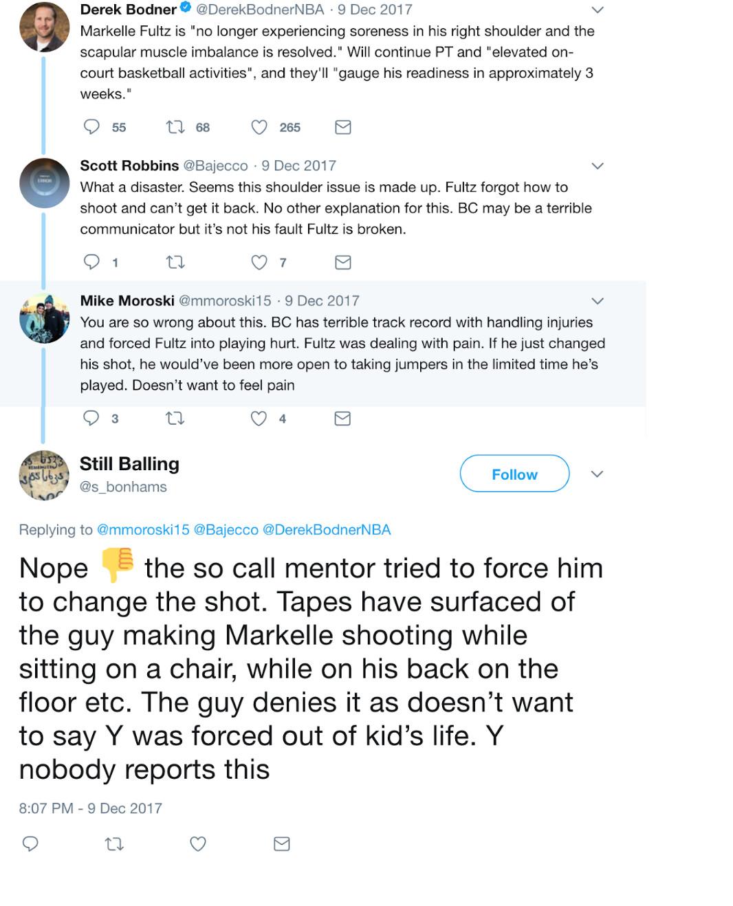 The accounts, though, peddle an alternative story that blames Fultz and Keith Williams, his family friend and longtime trainer. “If somebody would care to go look for the story of what happened with his so called mentor/father figure… it would explain a lot about the shoulder and Fultz ‘ state of mind,” Still Balling wrote in a thread responding to a December post from Bodner. “The so call mentor tried to force him to change the shot. Tapes have surfaced of the guy making Markelle shooting while sitting on a chair, while on his back on the floor etc. The guy denies it as doesn’t want to say Y was forced out of kid’s life. Y nobody reports this.”