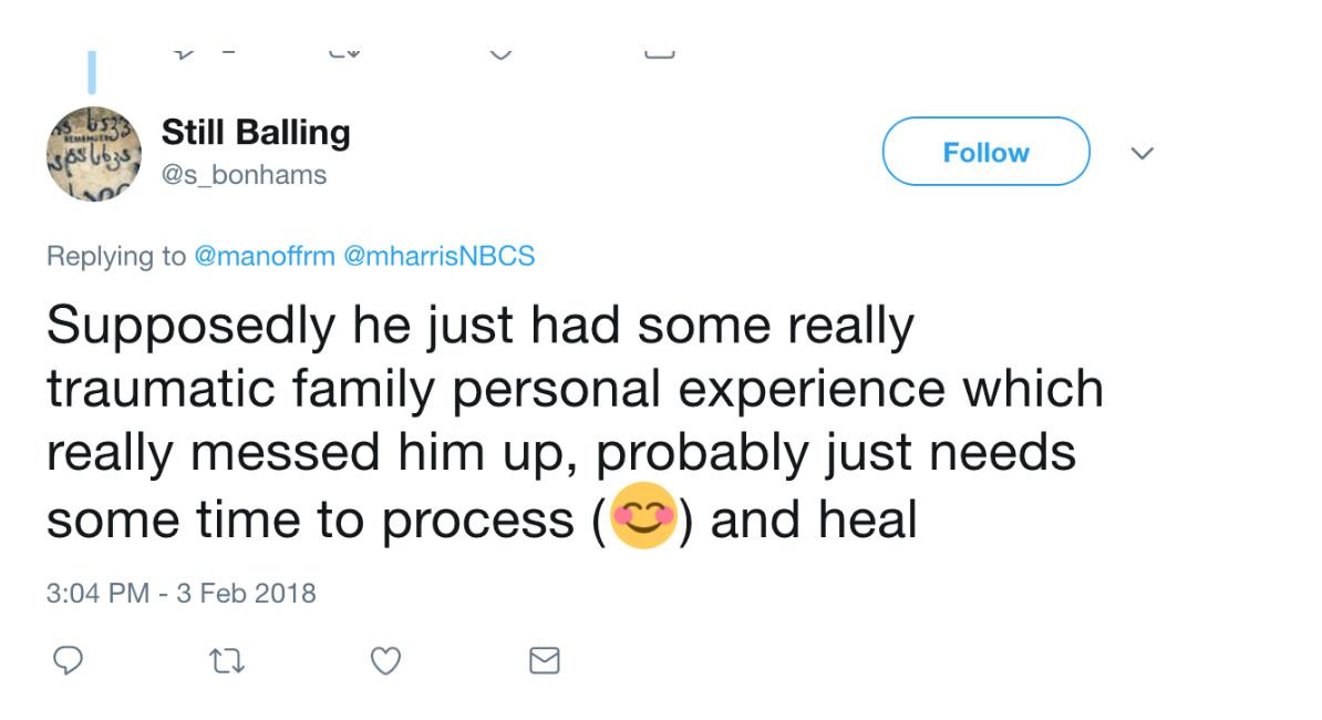 In early February, in a response to Marshall Harris, at the time of NBC Sports Philadelphia, Still Balling wrote, of Fultz, “Supposedly he just had some really traumatic family personal experience which really messed him up, probably just needs some time to process (☺️) and heal.”