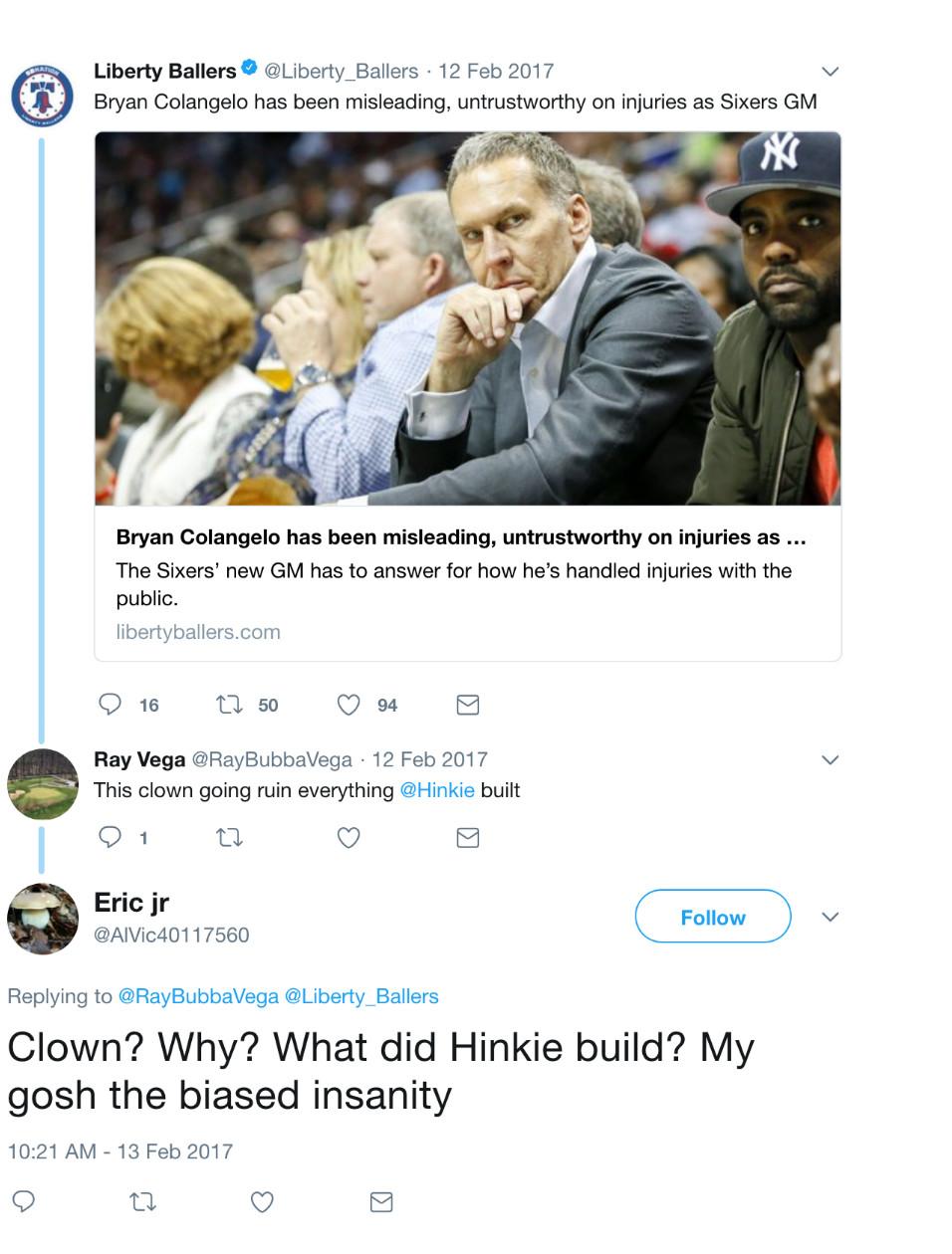 At first glance, I didn’t believe the accounts could be Colangelo. They were too inflammatory, too reckless. In posts ranging from April 2016 to last Tuesday, the accounts insulted the likes of Joel Embiid and Markelle Fultz; criticized coach Brett Brown; and bashed executives such as Sam Hinkie and Toronto president Masai Ujiri. And, at every turn, the accounts relentlessly defended or promoted Colangelo.