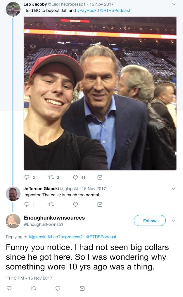 Several posts wandered from organizational matters, debating the size of Colangelo’s shirt collars. When user @Philly_Asshole commented on the executive’s well-documented sartorial preference, “This dude just love collars,” Enoughunkownsources responded, “That is a normal collar. Move on, find a new slant.”