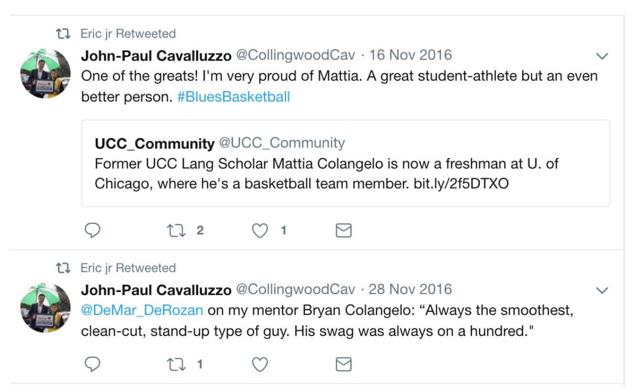 Eric jr has also followed a number of accounts related to the University of Chicago men’s basketball team. Mattia Colangelo, Bryan’s son, enrolled at the school in 2016 and currently plays for the Maroons. Eric jr has followed four of Mattia Colangelo’s teammates. Eric jr and @Phila1234567 have also followed John-Paul Cavalluzzo, an educator in Vancouver and the former basketball, football, and track coach at Ontario’s Upper Canada College, the high school where Mattia Colangelo played until 2016. In a tweet from November 28, 2016, Cavalluzzo described Bryan Colangelo as “my mentor.” Colangelo, who was hired by the Raptors in 2006 and left the organization in 2013 after being stripped of his GM duties, lived in Ontario before taking the Sixers job.