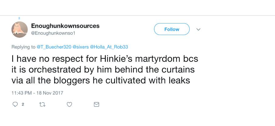The same account grumbled that the media was unfairly burnishing Hinkie’s reputation after leaving Philly. “I have no respect for Hinkie’s martyrdom bcs it is orchestrated by him behind the curtains via all the bloggers he cultivated with leaks,” Enoughunkownsources wrote in November.
