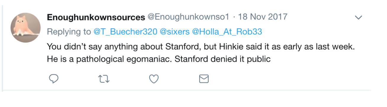 Hinkie, who penned a 13-page resignation letter about team-building theory that included analogies about flightless birds from New Zealand, is a frequent target of vitriol from the accounts. “Funny how you remember his resignation letter, down to its paragraph,” Enoughunkownsources sneered in response to a post praising Hinkie. “I could not get pass the first page…”