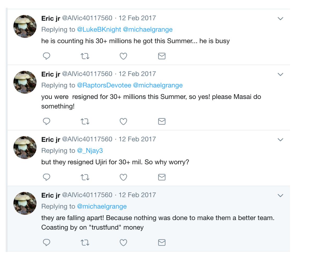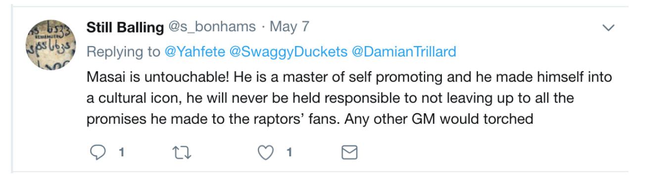 He chafed at the lucrative long-term extension Ujiri signed in the fall of 2016. “You were resigned for 30+ millions this Summer, so yes! please Masai do something!” the account pleaded, feigning the persona of a Raptors booster.