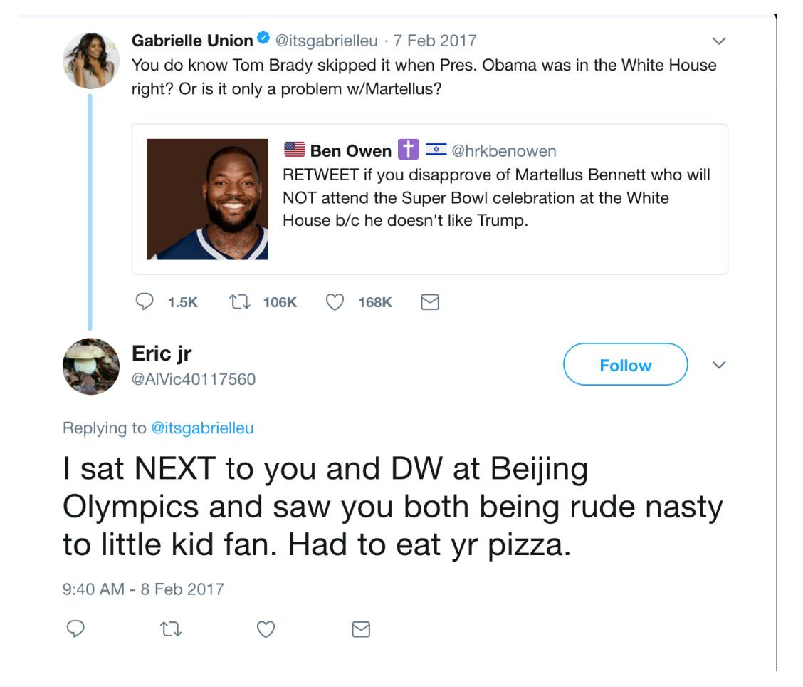 In two responses to a February 2017 tweet from actress Gabrielle Union, who pointed out that Tom Brady didn’t visit the White House when Barack Obama was president, Eric jr went on the attack. “I sat NEXT to you and [Dwyane Wade] at Beijing Olympics and saw you both being rude nasty to little kid fan,” the account said. “Had to eat yr pizza. … You showed no respect to this little kid, who are you to stand on high grounds? Never looked at DW the same after that.” During the 2008 Olympics, Jerry Colangelo, then the managing director of the U.S. men’s national basketball team, was in Beijing.