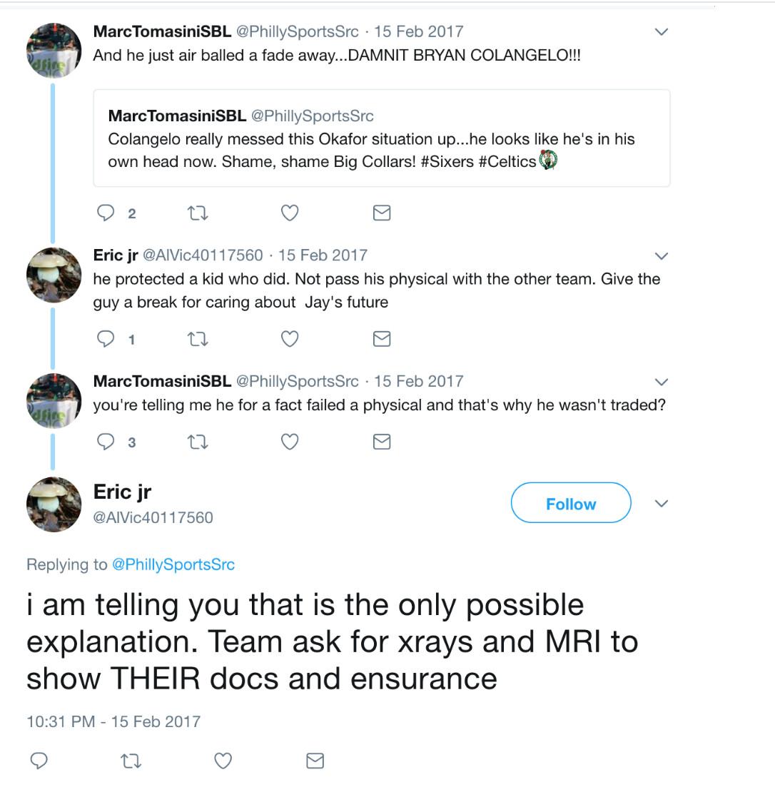 When Okafor rejoined the Sixers in Boston on February 15, Colangelo was criticized for creating an embarrassing situation for the second-year center. From that point onward, Eric jr (and other accounts) consistently claimed, dozens of times, that a deadline deal involving Okafor was derailed by a failed physical. A source tangential to the prospective trade told me that he wasn’t sure why the transaction never went through, but necessary paperwork had been drawn up and “the expectation was that the trade would be completed.”