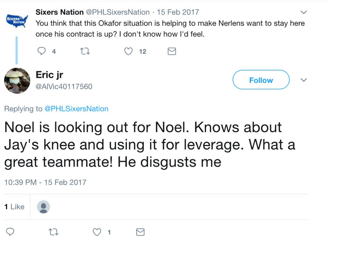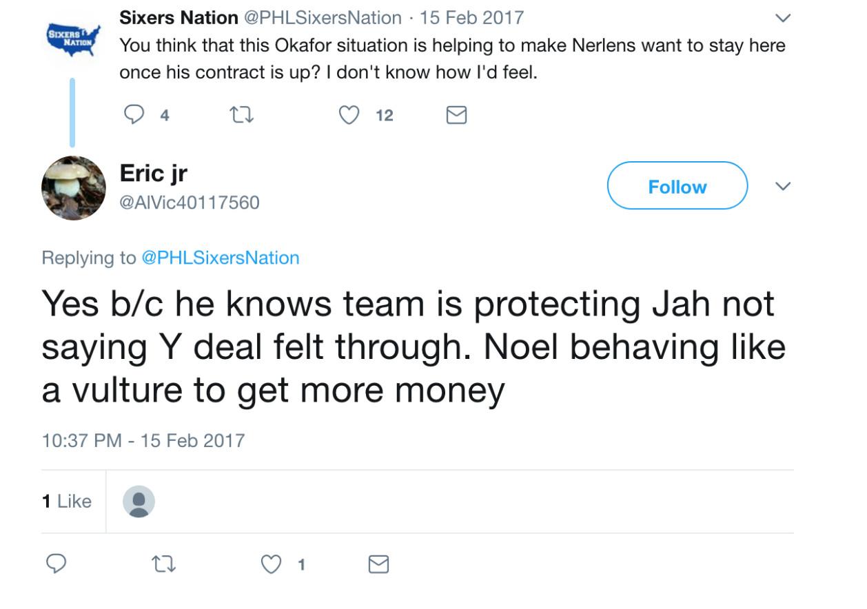 The anti-Okafor campaign resumed early in the 2017-18 season, this time from a different account, when it was reported that Okafor wanted to be traded out of Philadelphia (he was eventually dealt to Brooklyn in December; he would have had to have passed a physical at that time for the deal to have gone through). “Nobody wants him,” Enoughunkownsources posted in a pair of responses to ESPN’s Adrian Wojnarowski. “Last year he was traded and sent back because he didn’t pass physicals. He asked FO not to let the info out...Still the FO is not leaking the truth to save face, Okafor abusing that. If the truth came out Okafor would be the one looking bad.”