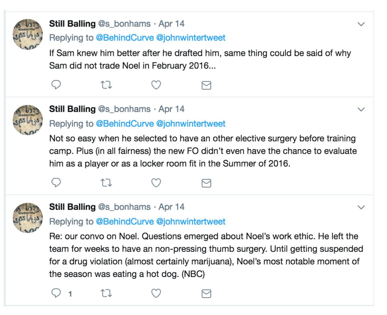 Colangelo also took heat when Noel was sent to Dallas at the 2017 deadline for Justin Anderson, Andrew Bogut, and an announced “first-round pick” that was almost certain to convey as two second-rounders. The accounts didn’t attempt to defend the modest return; instead, they described Noel as a “selfish punk” who was “behaving like a vulture.” Noel was traded, the accounts asserted, because the Sixers’ head coach disliked him. “Bret Brown wanted NN gone,” Enoughunkownsources posted in November 2017. “Bad for locker room. Once again Colangelo protected coach and got sh@t on for it. Bc is class act not a bad guy.”