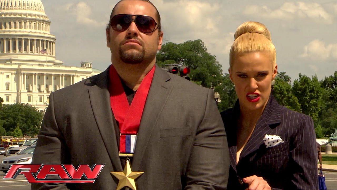 Since Arriving in WWE, Rusev has epitomized the veritable sine wave of an enduring pro wrestling career. He debuted as auspiciously as one can, appearing as the sixth entrant in 2014’s Royal Rumble and, despite failing to win that 30-man contest, embarked on a 146-day undefeated streak. Despite his documented Bulgarian roots, Rusev’s gimmick was rejiggered slightly to ally him more explicitly with Lana’s beloved Russia, making him an unambiguous adversary for earnest patriots like John Cena and Jack Swagger (the latter of whom had only recently portrayed a survivalist xenophobe, but whatever). It was all fun and games for Rusev and Lana during their early roll (including a smug, token turn with the U.S. Championship belt), as they scandalized exactly no one by broadly offering praise to Vladimir Putin (which was, if Lana is to be taken at face value, reciprocated by Putin’s awarding Rusev a medal) while snickering at then-President Barack Obama’s perceived ineffectualness.