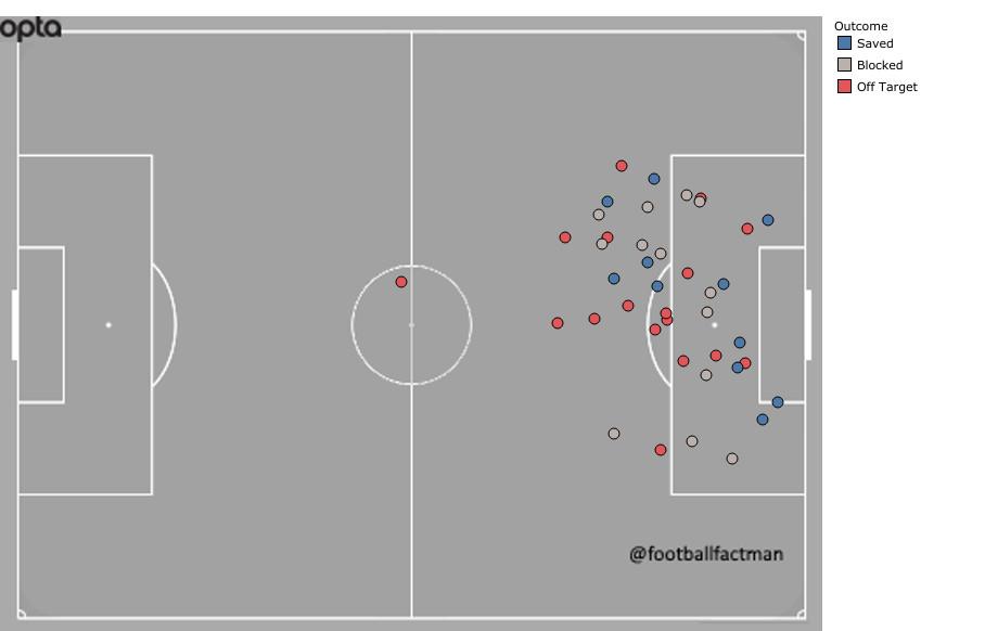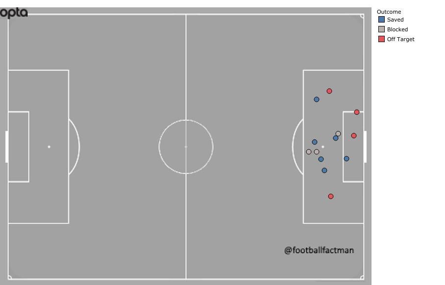 However, most of the chances Trippier has created have come from either crosses (seven), corners (six), or free kicks (three). From open play, Raheem Sterling has been the team’s leading creator. Granted, he’s only created four chances, but the number’s not that far off his per-90-minute rate with Manchester City this season: 1.5 to 1.9. The bigger drop-off comes from Sterling’s shooting numbers, as he averaged three per 90 in the Premier League and has only produced 1.8 attempts per 90 at the World Cup.