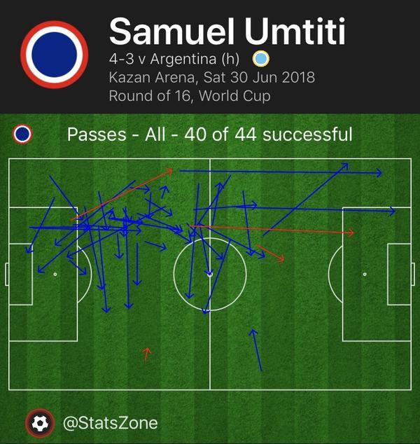 Although Umtiti is proficient in many of the same areas that Stones and Alderweireld are, he hasn’t impacted his team’s attack quite as much at the World Cup because of the system he plays in. The 24-year-old would likely see far more direct involvement in the attack if manager Didier Deschamps adopted a more offensive style of play by using attacking-oriented fullbacks Benjamin Mendy and Djibril Sidibé instead of converted center backs Lucas Hernández and Benjamin Pavard. However, Umtiti’s passing to France’s attackers still provides a solid alternative when the midfield can’t find a way through. While it still seems like the team is capable of so much more than a succession of unspectacular victories, France haven’t come close to faltering yet. The plethora of options they have in attack helps the conservative approach they’ve taken, but so does Umtiti’s play. It’s not often a midfield featuring Paul Pogba and N’Golo Kanté can be shut down, but if it ever is, Umtiti’s ability to quickly move the ball to France’s forwards can make the difference. This was on display in the 4-3 win over Argentina: