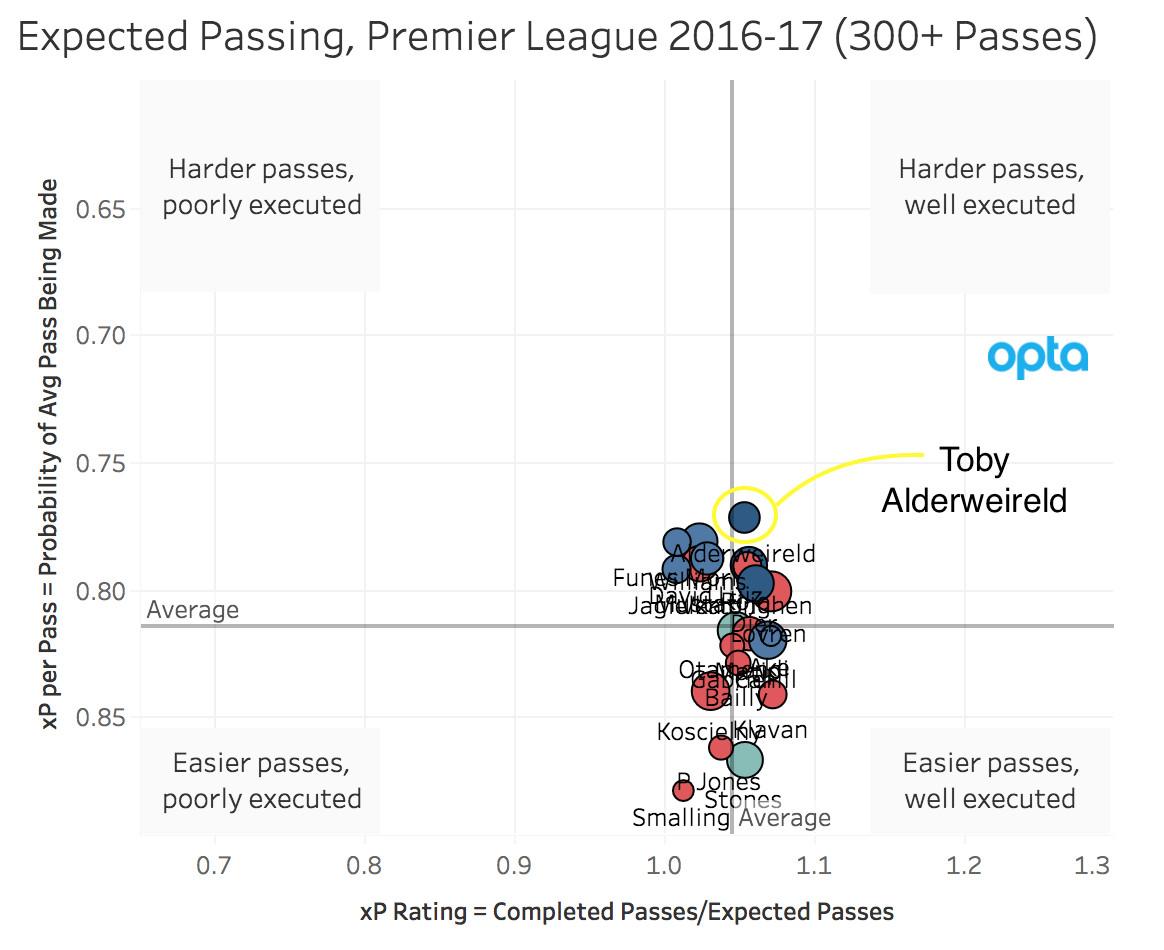 Alderweireld is one of the most accurate long passers in the world, especially when he’s given time and space. The Belgian can also provoke defenders forward like Stones does, but he’s defined by his ability to ping a pass. The analyst Paul Riley has an expected passing model that tallies the difficulty of passes attempted by a given player and then compares his completion rate to that of an average player. The model shows that Alderweireld is in a class of his own when it comes to long balls.