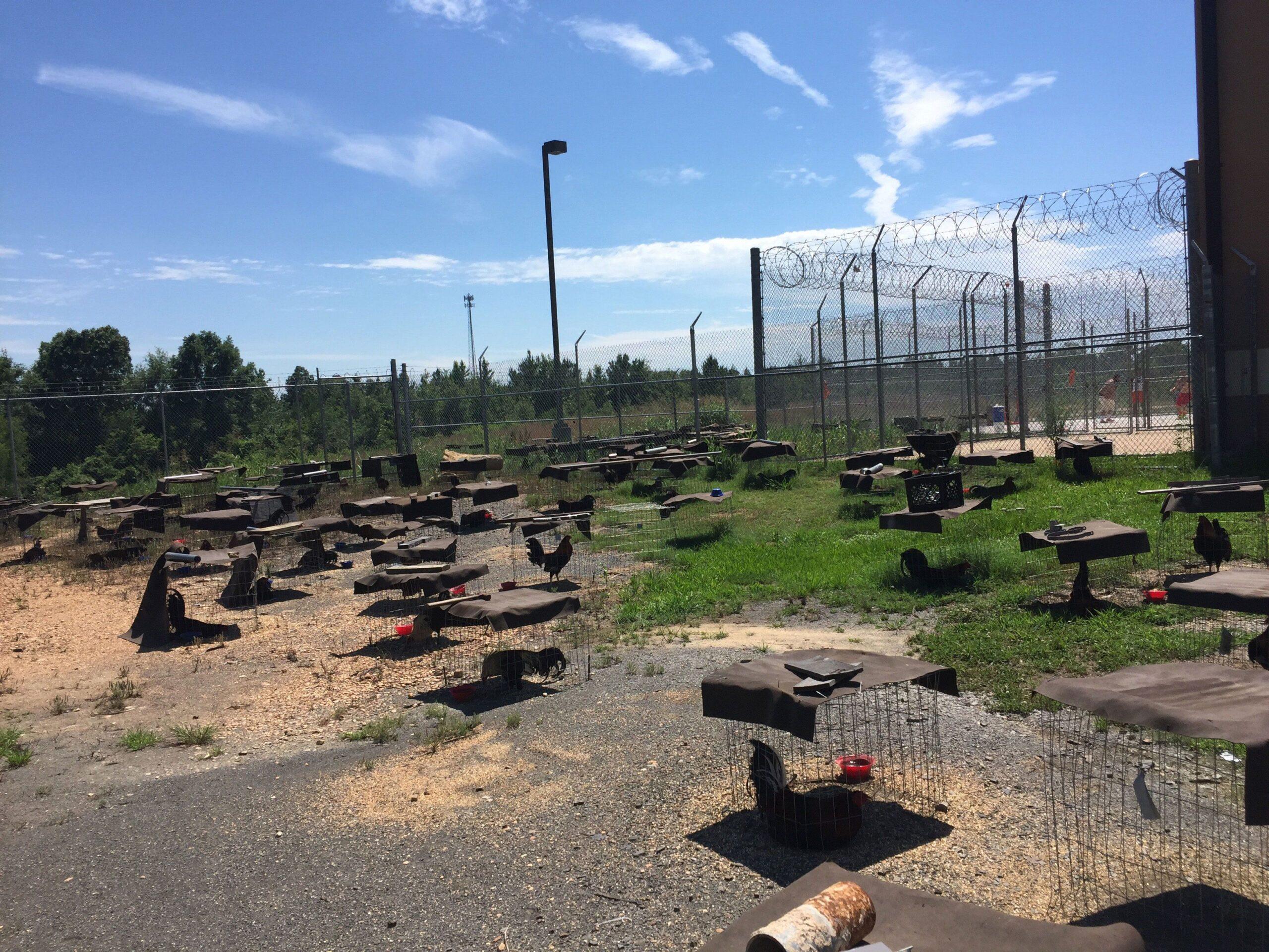 Surrounding the Sevier County Jail in all directions, as far as the eye can see, are little cages roughly 2 feet square, each containing its own rooster, nearly 200 birds in all. “We were told that we’ve probably got birds out here on the yard that cost as much as five grand,” Gentry bragged to me. Behind us a group of inmates played basketball, shedding their orange jumpsuits in the scorching summer sun. The sound of their game was periodically drowned out by the calls of the roosters. The prisoners feed and water the birds every day, even though the crowing outside the jail drives them crazy. “Honestly the inmates hate them,” Gentry said. “It gets really loud. You can hear it inside through the walls.”