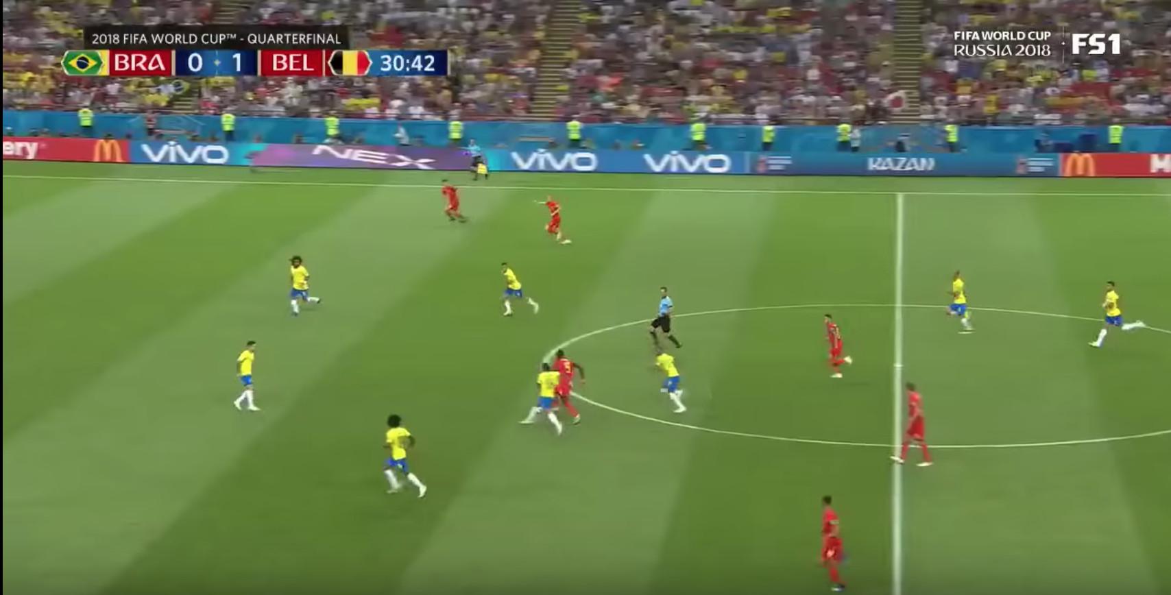 The top strikers in the world—your Robert Lewandowskis, Harry Kanes, and Luis Suárezes—will continually draw this kind of attention by merely orbiting the ball, and Lukaku has perceptively used that spotlight to set up chances for his teammates as well as himself. Belgium’s second goal against Brazil saw Lukaku pacing down the middle of the pitch on another deadly counter—this time, with the ball at his feet. After zipping past Fernandinho at midfield, and just before Paulinho attempted a tackle of his own, he slipped the ball to De Bruyne. De Bruyne still had some work to do and smacked one hell of a shot, but Lukaku was the play’s driving force and conductor. Just before the pass, six Brazilians were keyed in on Lukaku—and none were watching Kevin De Bruyne.