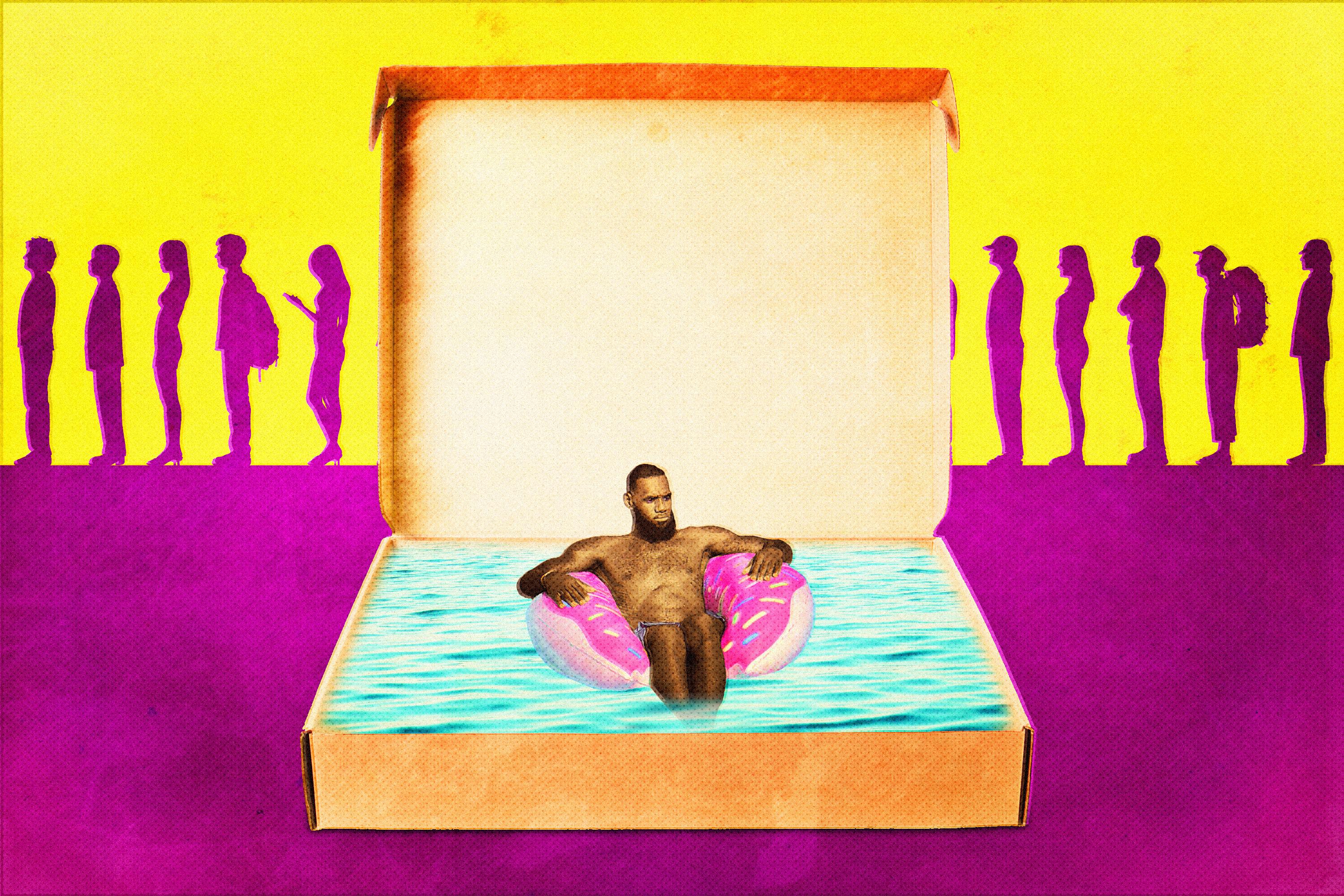 When a luxury car pulled into the parking lot, dozens ran out of the line to swarm the vehicle, thinking LeBron was inside. He wasn’t, but the incident allowed people at the back of the line to easily cut to the front, and thus the fragile social contract separating this pizza party from pizza anarchy burst open at the seams. The front of the line was replaced by an amorphous, shape-shifting zombie hoard that engulfed the door James was supposedly going to enter. To maintain order, the staff created two lines: one to meet LeBron, and one for pizza. Eventually, everyone realized they should pick pizza.