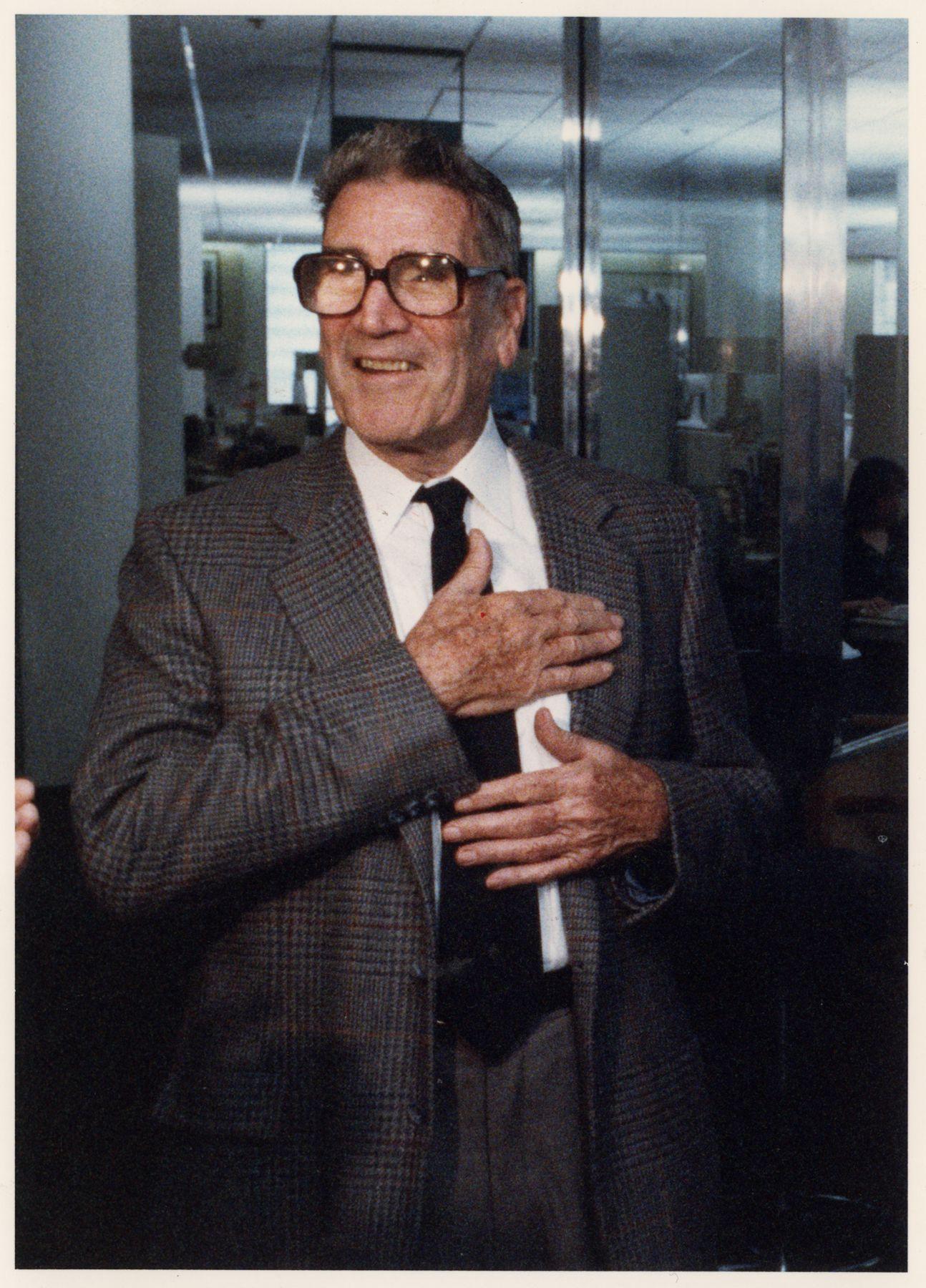 He led me past the desks in Metro (“This is the bastion of union organizing,” he said with a smile) to a far corner of the newsroom. On April 12, 1990, at 12:11 p.m.—the Times’ internal newsletter was precise on this—word came over the wire that sports columnist Jim Murray had won the Pulitzer Prize. Murray was surrounded by his colleagues in the newsroom. “All I ever did was quote Tommy Lasorda accurately,” he said. Rodriguez and I looked into a glass case that still held the congratulatory notes Murray got from Tom Brokaw and Steve Allen.