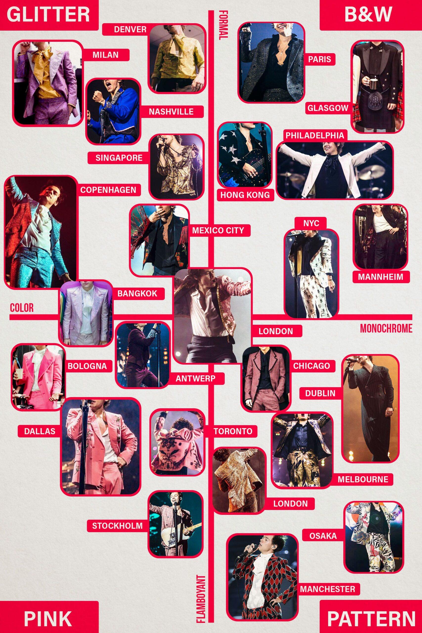 Tragically, the tour is now over: Harry played his final show in Los Angeles on Saturday. While this is a sad and unavoidable truth—the onslaught of looks has ended—it’s also a positive thing. Because now I’ve had enough downtime to create the Harry Styles Style Matrix: a chart highlighting some of Harry’s most iconic looks of the year, the best of the tour’s pink, black-and-white, patterned, and glittery suits.