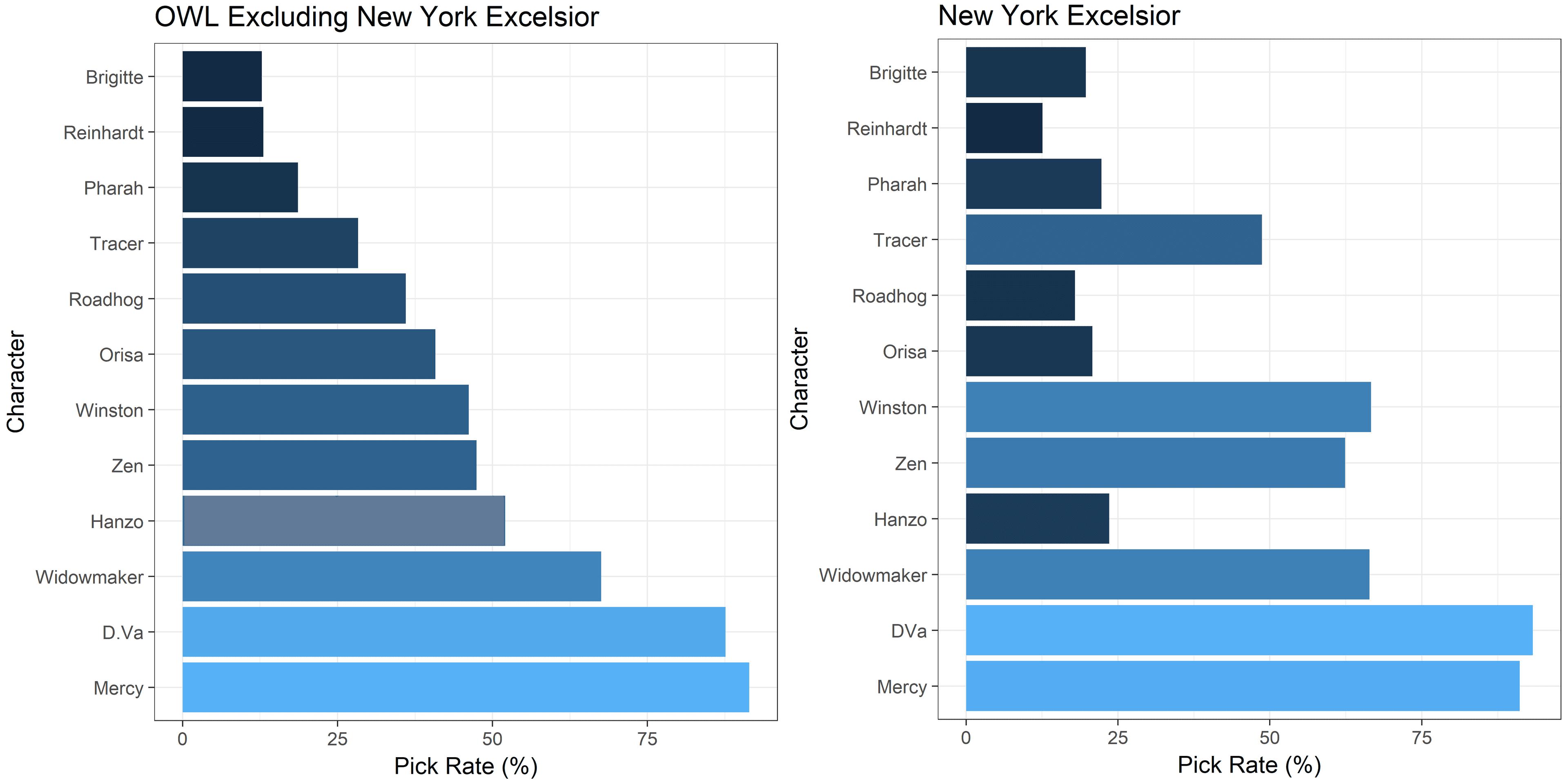 Although the Excelsior fared better in that second match, those adjustments were too little and too late. Judging by a post-match tweet from NYXL support player Yeon-jun “Ark” Hong, the new tactics may have left the players feeling unprepared. And even after their mid-playoffs adjustment, the Excelsior’s overall playoff hero selection was still out of step with the rest of the playoff field, as the following charts reveal.