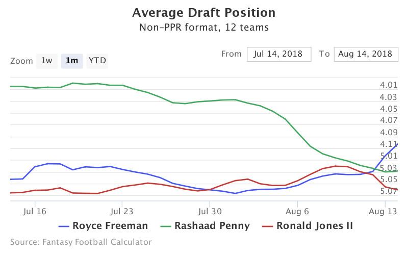 Freeman is currently being taken 48th in 12-team drafts, making him a late-fourth-rounder. But as Penny and Jones’s stocks fall, Freeman’s is rapidly climbing and may be even higher by late August. Check out how his ADP has moved compared with his rookie colleagues’: