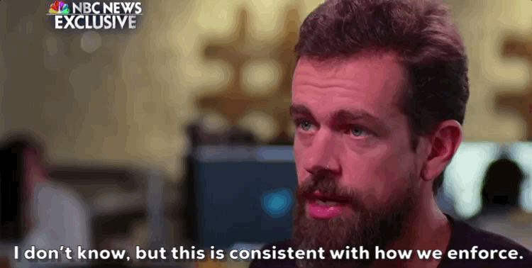 Dorsey does an interview with Lester Holt to explain Twitter’s hesitancy to ban Jones and the decision to finally do so, if temporarily. When Holt asks for an explanation of what happened on August 14, Dorsey responds, “I believe we put him in a timeout … for a time period.”