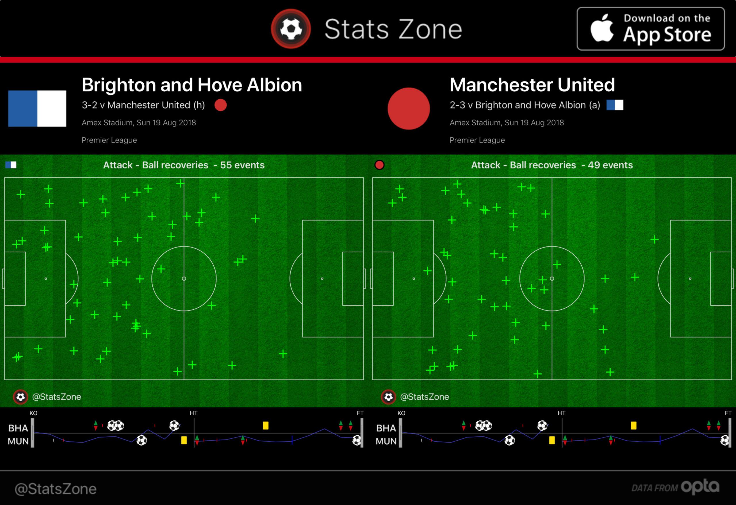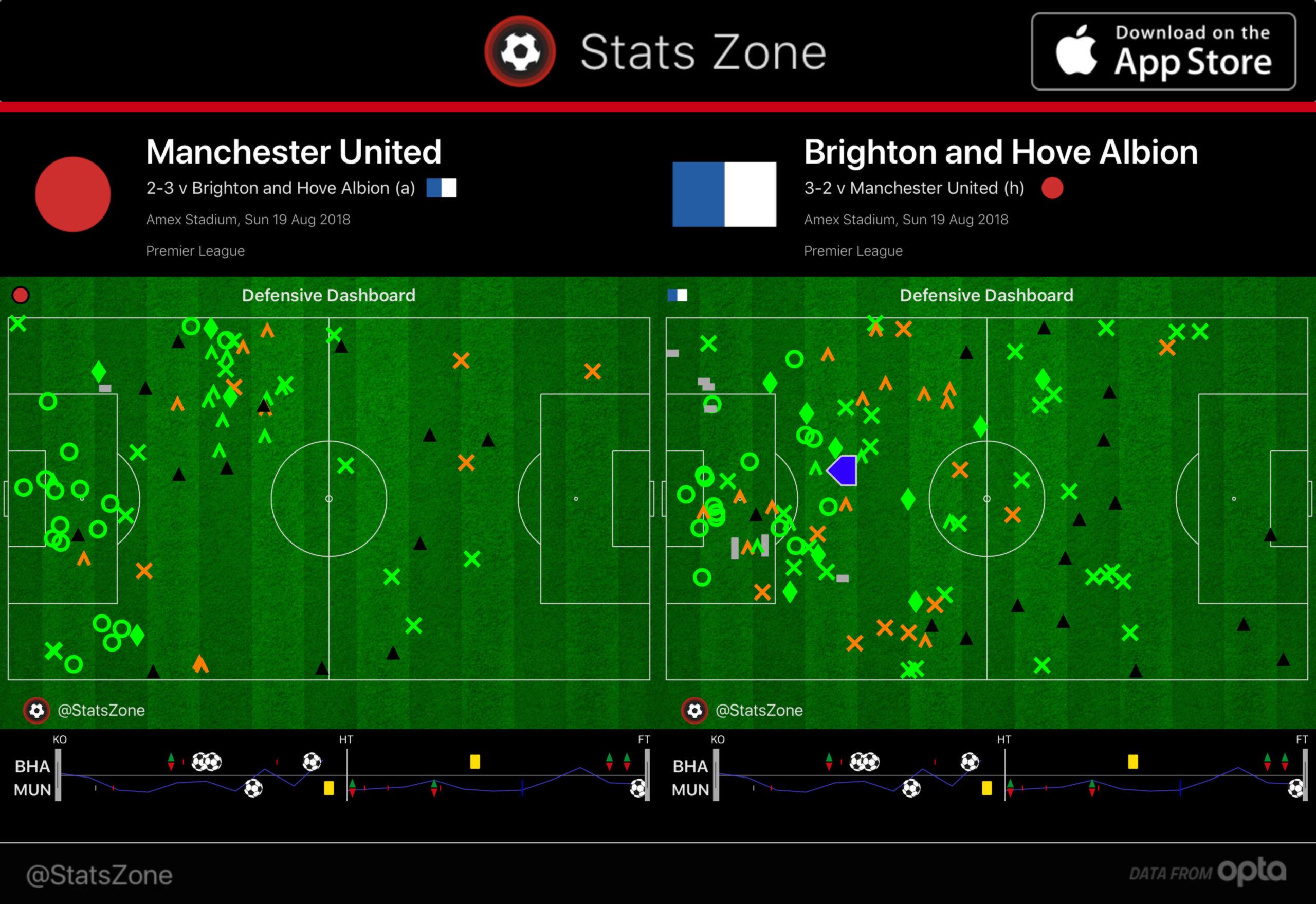 Against Brighton, United dominated possession, but they constantly won the ball back in their own half and then had an entire opposition 11 to play through. If anything, Brighton were the more aggressive defensive side. Here’s where the defensive actions occurred for both sides: