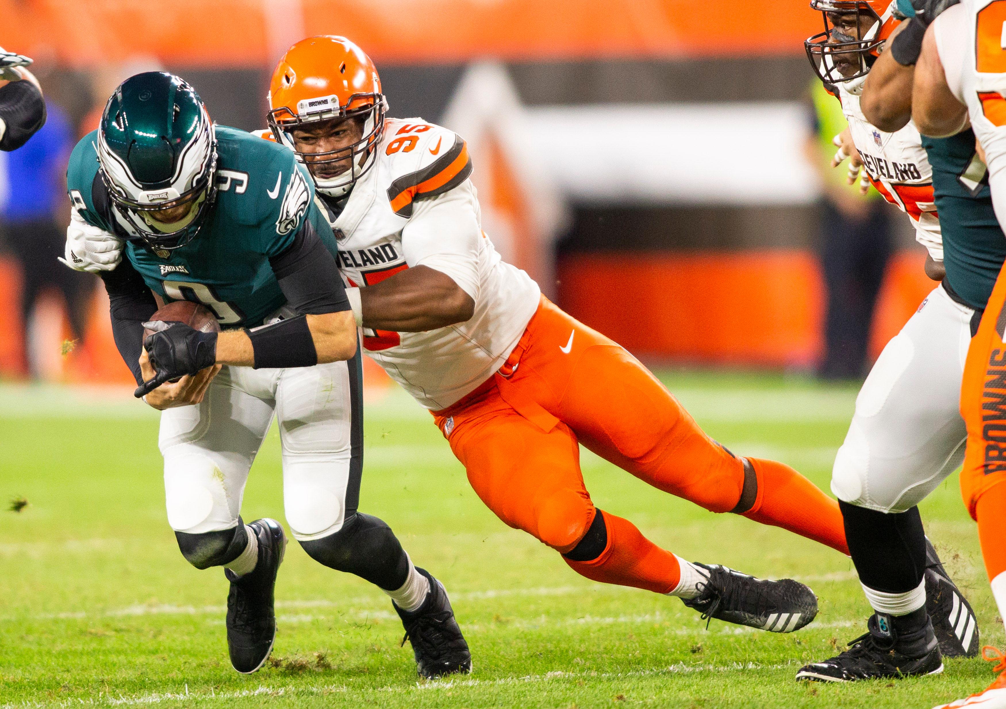 When the Eagles got the ball back, the Browns’ fifth-round rookie linebacker, Genard Avery, stripsacked Foles on first down. Garrett was also a key part of this play, taking Eagles left tackle Halapoulivaati Vaitai for a test drive into the backfield, forcing Foles to step into the pressure.