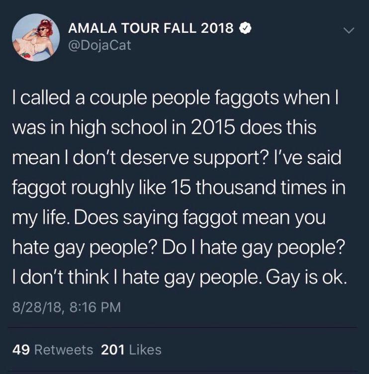 Surely The New York Times’ Sarah Jeong saying “white men are bullshit” doesn’t equate to Milwaukee Brewers reliever Josh Hader tweeting that “gay people freak me out.” Much how Eminem hurling “faggot” as an insult at the age of 45 is quite different from tweeting the epithet when you’re a teenager. All things considered, it might be best that this occurred before Doja Cat reached mainstream popularity. The amount of trust and goodwill built up over the course of 14 or so business days might be easier to rebuild than that which was built up over a decade. (*Cough* Kanye Omari West *cough*.) Nevertheless, there is no hard-and-fast rule for accountability, no easy guide through the swaying thicket of grievance politics.