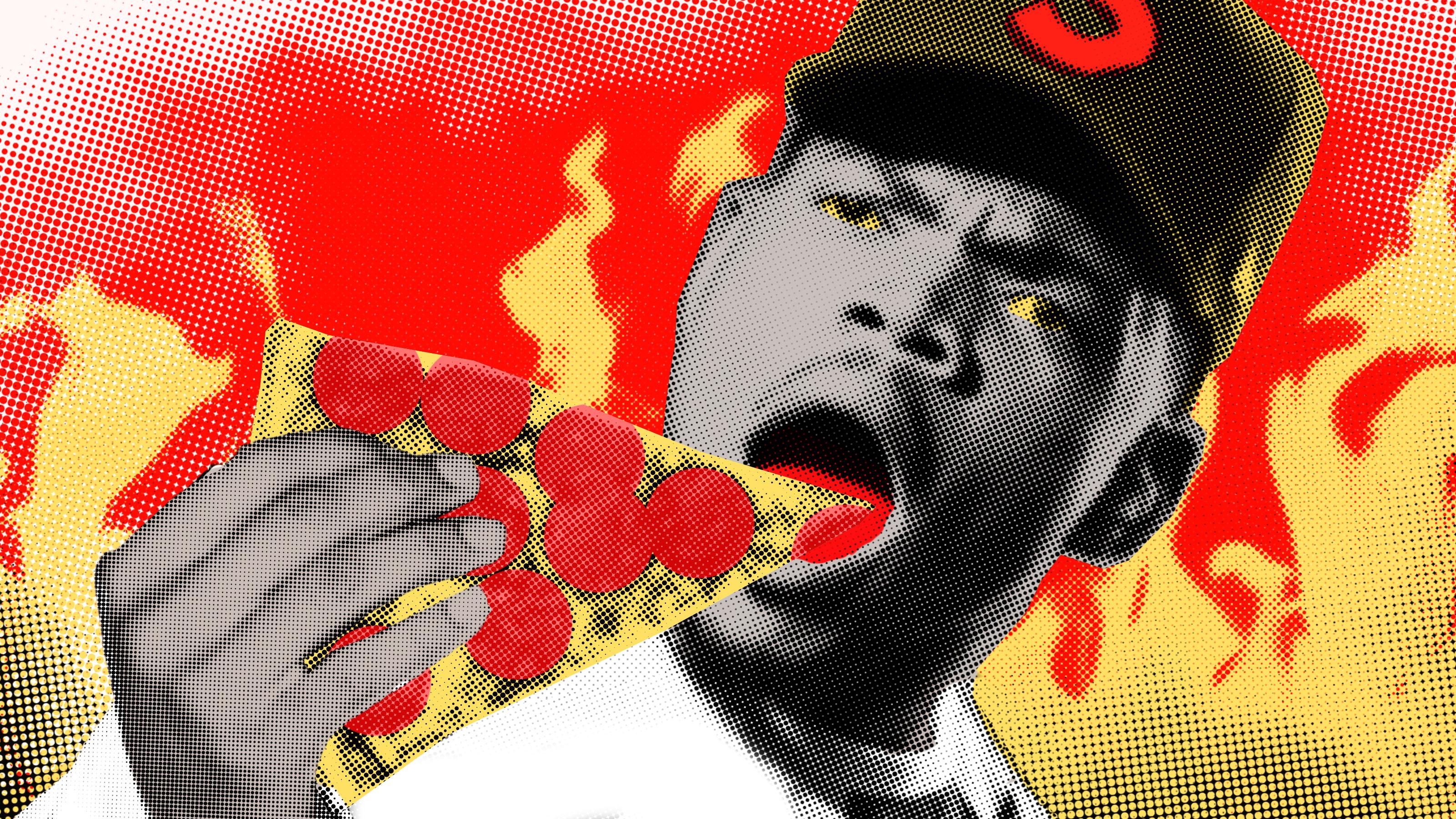 The journey finally ended Monday, when the Slice premiere was held at the ArcLight Cinema in Chicago, a couple of blocks north of the former Cabrini-Green grounds where Candyman once lurked. (Now he’d be wandering the aisles of a Target.) News trucks lined the cul-de-sac in front of the theater. Inside, the screens of four packed auditoriums were filled with images of body bags and blunts smoked in slow motion. Despite the grandness of the multiplex screen, it still felt like the kind of movie you’d catch on VHS in your friend’s basement. In the title sequence, there’s an early clue that sets the tone — an animated eyeball drips down and settles as a pizza topping.