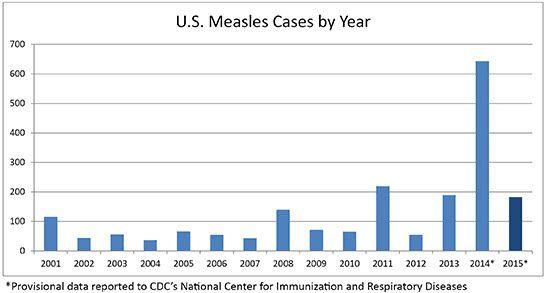 Measles used to be a common disease in this country, with hundreds of thousands of cases per year. But in the 1960s work began on a treatment, culminating in the development of the MMR vaccine in 1971. As you can see from the chart, widespread vaccination essentially ended the disease. In 2000, the CDC declared that measles had been eliminated.