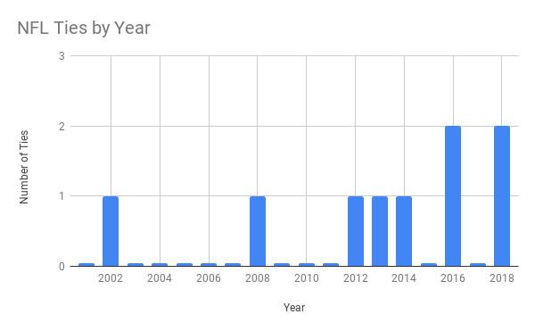 The chart undersells the current tie outbreak. Two weeks into the 2018 season, there have already been two ties: The Browns and Steelers played to a 21-21 stalemate in Week 1, and the Vikings and Packers played to a 29-29 draw in Week 2. I expect there to be at least one more tie over the final 15 weeks of the season; if that happens, this will mark the NFL’s first three-tie season since the tie vaccine known as overtime was introduced.
