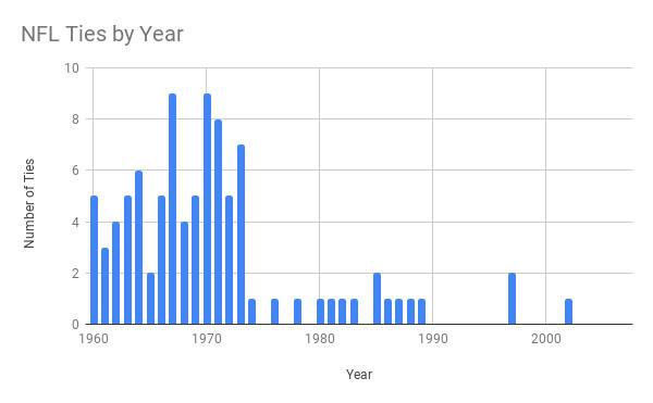 The NFL could have declared ties eliminated in 2000, too. The tie used to be a common result for NFL games, peaking in 1967, when the league had a whopping nine ties during a regular season consisting of just 112 games. Then, in 1974, the league introduced a ties vaccine—overtime, ensuring that if regulation ended with the score even, the teams would keep playing. As you can see from the chart, widespread vaccination essentially ended the tie. From 1990 to 2007, there were only three ties, despite the number of NFL games increasing to more than 250 per season.