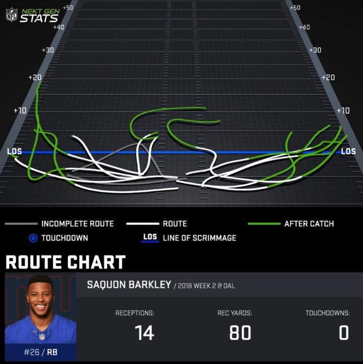 We don’t need numbers to just see why the majority of Barkley’s receptions weren’t going to make a big difference for the Giants’ offense. Here’s his route chart from Sunday’s game, via NFL Next Gen Stats. Note that the green signifies the yards after the catch, that nearly every one of his routes start from the same spot in the backfield, and none threaten the defense vertically.