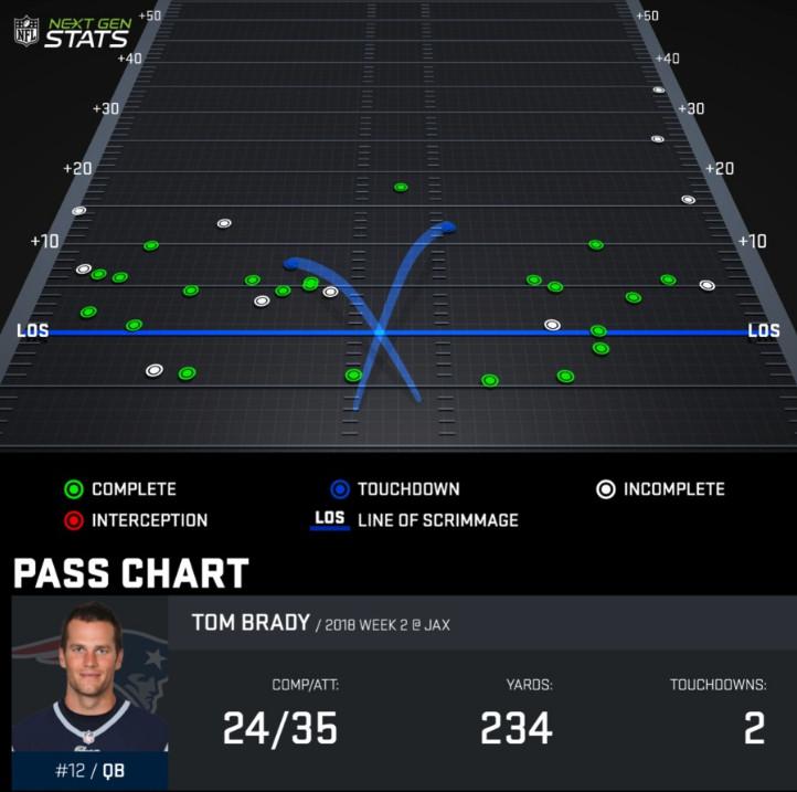 Brady’s still Brady, of course, and connected on a pair of slant-route touchdowns to Hogan, but the future Hall of Famer ended the day averaging just 6.7 yards per attempt. His Week 2 passing chart via NFL Next Gen Stats tells a pretty clear story (especially when compared to the AFC championship game chart) of what went wrong: With Cooks gone, New England lacked the ability to really challenge on the perimeter, an area of the field patrolled by the Jaguars’ top-tier cornerback duo of Jalen Ramsey and A.J. Bouye.